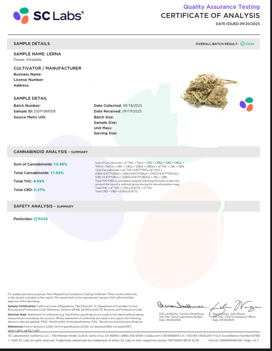 CBD content ranges from 2%-6% so some of the lower potency material is 1:1 THCA CBD biomass.