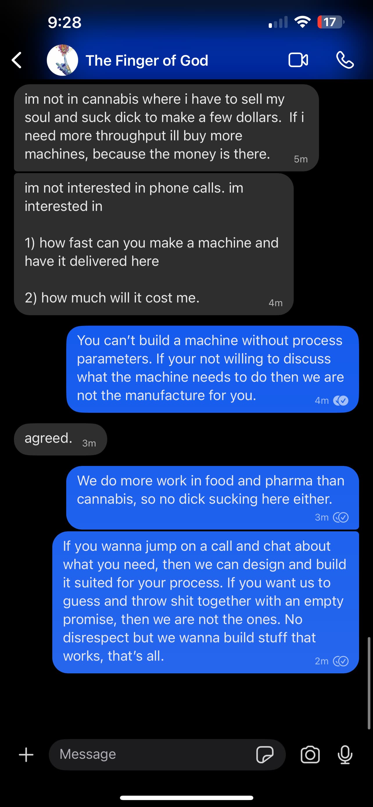 You want people to build custom process equipment for you without providing any context or process parameters, especially when talking about non-cannabinoids. If thatās how you wanna work together, then you donāt have to work with us, itās not personal. Hoping on a call to discuss custom equipment is not an out of the ordinary ask. Have a nice day.