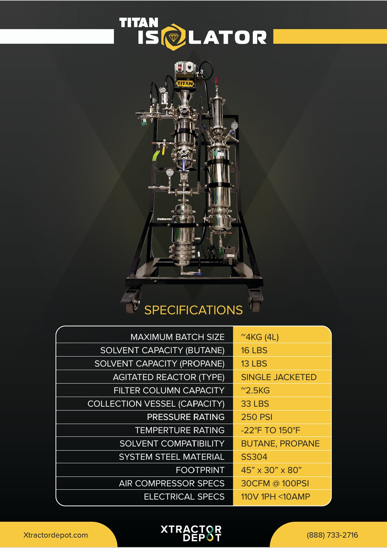 Hereâs a couple of spec sheets for our 4 Liter and 8 Liter Isolators. Due to current demand, wait time is up to 8 weeks from the time of payment to the time of shipping. When comparing prices, make sure to check that the peer review, training, and support is included. Our Isolator, combined with our training and SOP will have you cranking out 98-99% thca reliably, day in and day out.