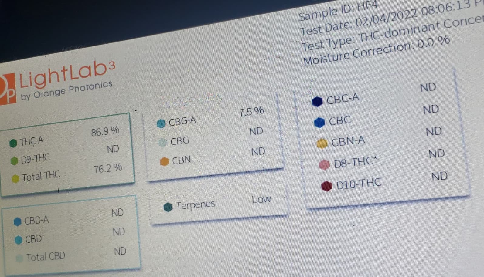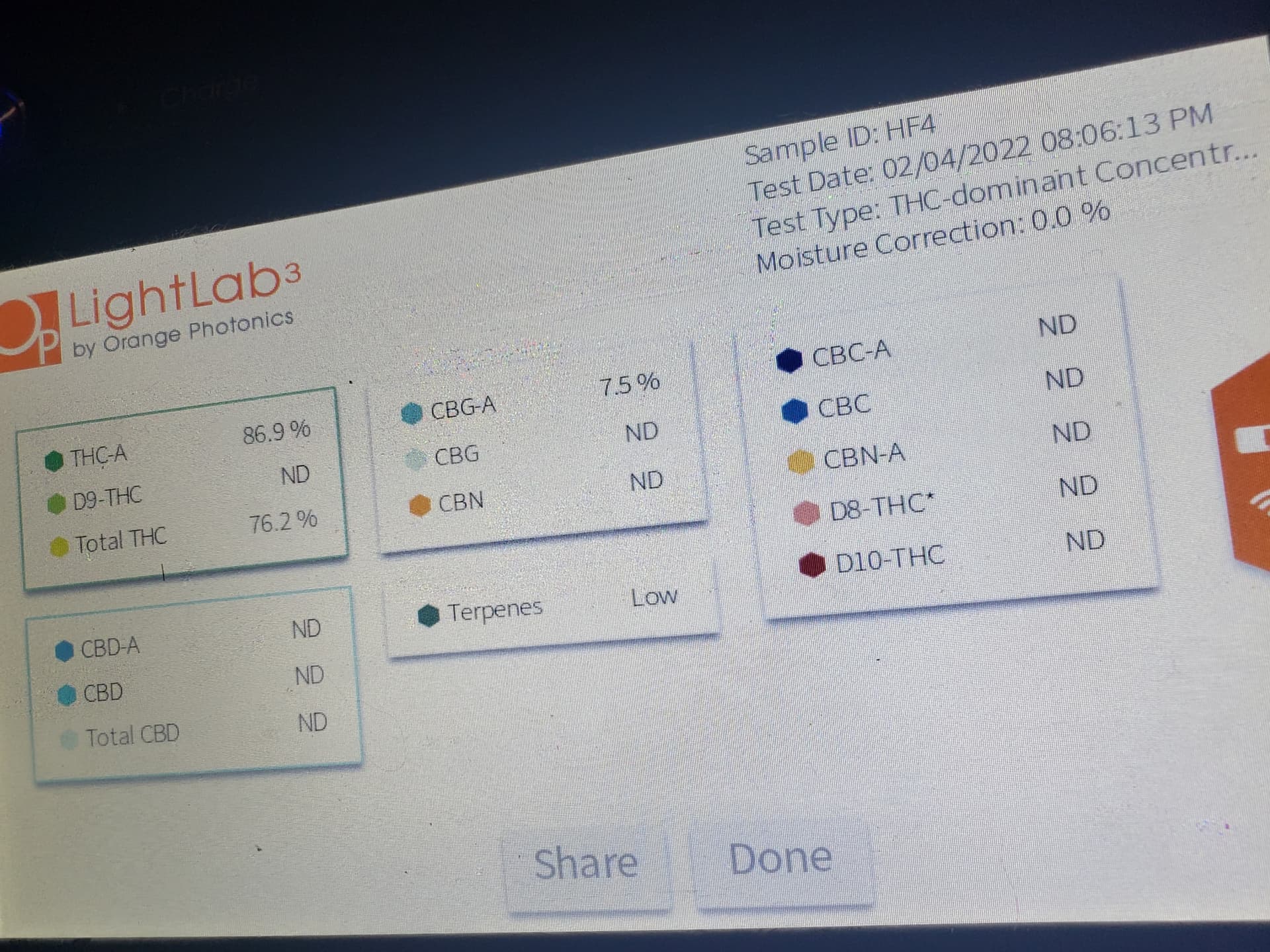Let me see if i can find the results for my test at the meet-up. I think it was 85% total 75 thca? Lots of cbg-a which most extracts crush yet I’ve had a lot of “I haven’t been so fucking high in awhile” comments from that strain