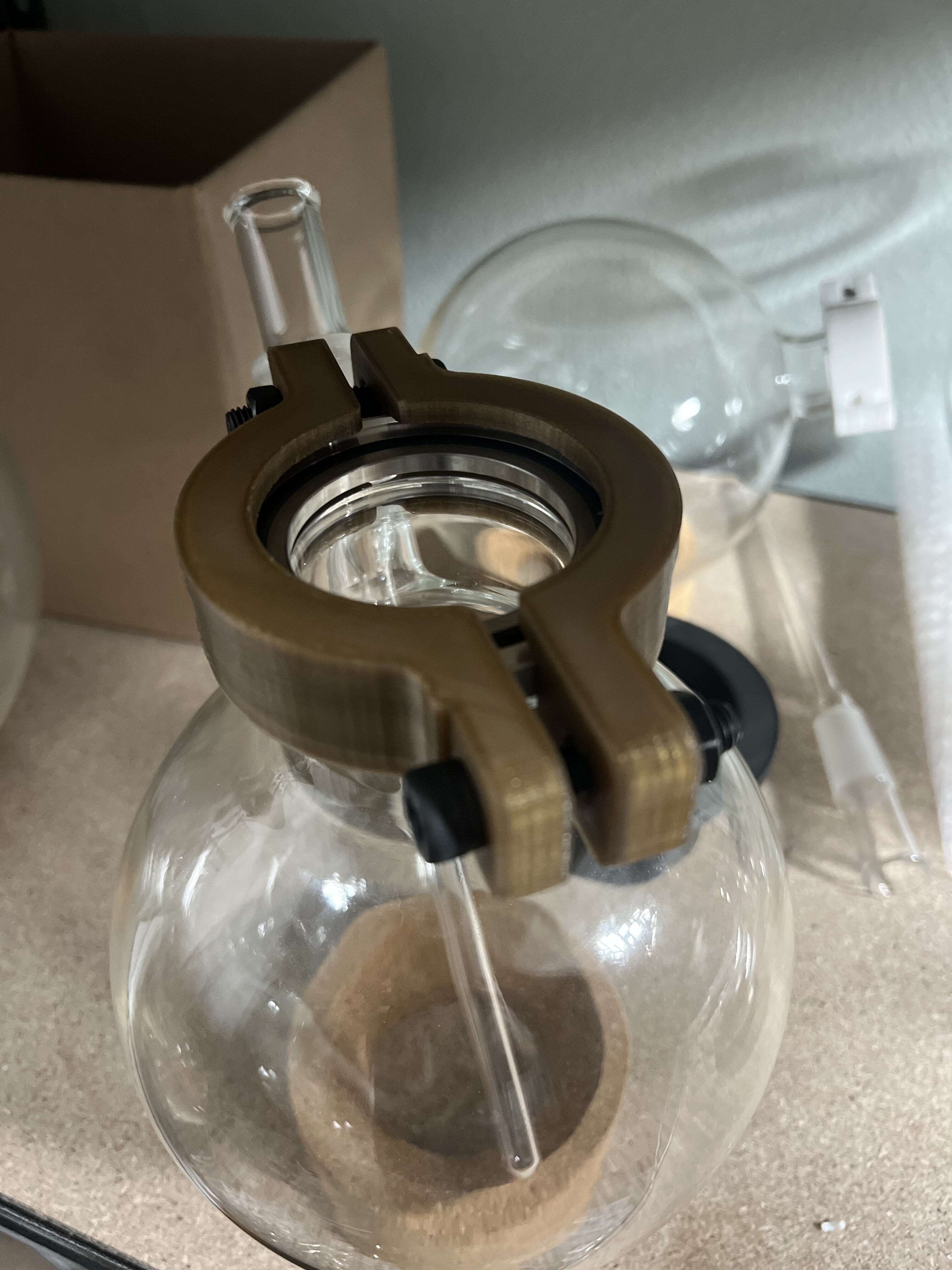 For these clamps in the picture the part of the clamp in contact with glass is aluminum and is fairly loose fitting. I also have a high temp plastic option that seem to work okay at the temps this system operates but I’m still testing. This glass is thick and is barely under any force. I will be shocked when our first customer breaks a flange.