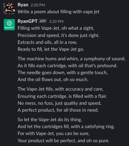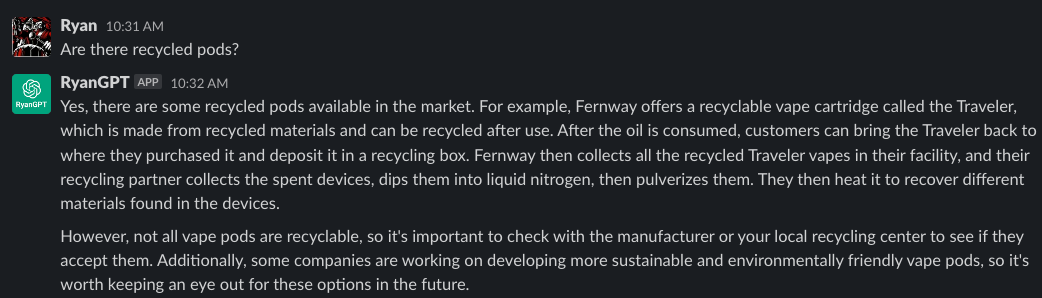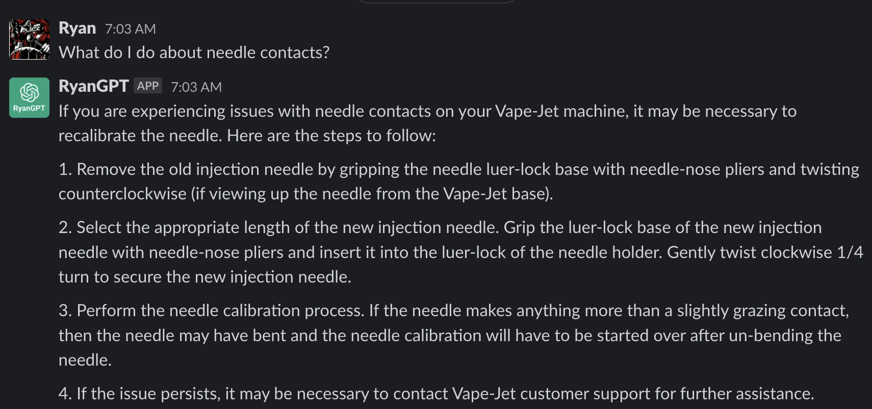 I made a thing. Gave GPT some medium and long term memory, and threw all of our support history and documentation into a vectorDB. Wrapped it all up in a slack bot for internal support agents to quickly search and summarize information.
