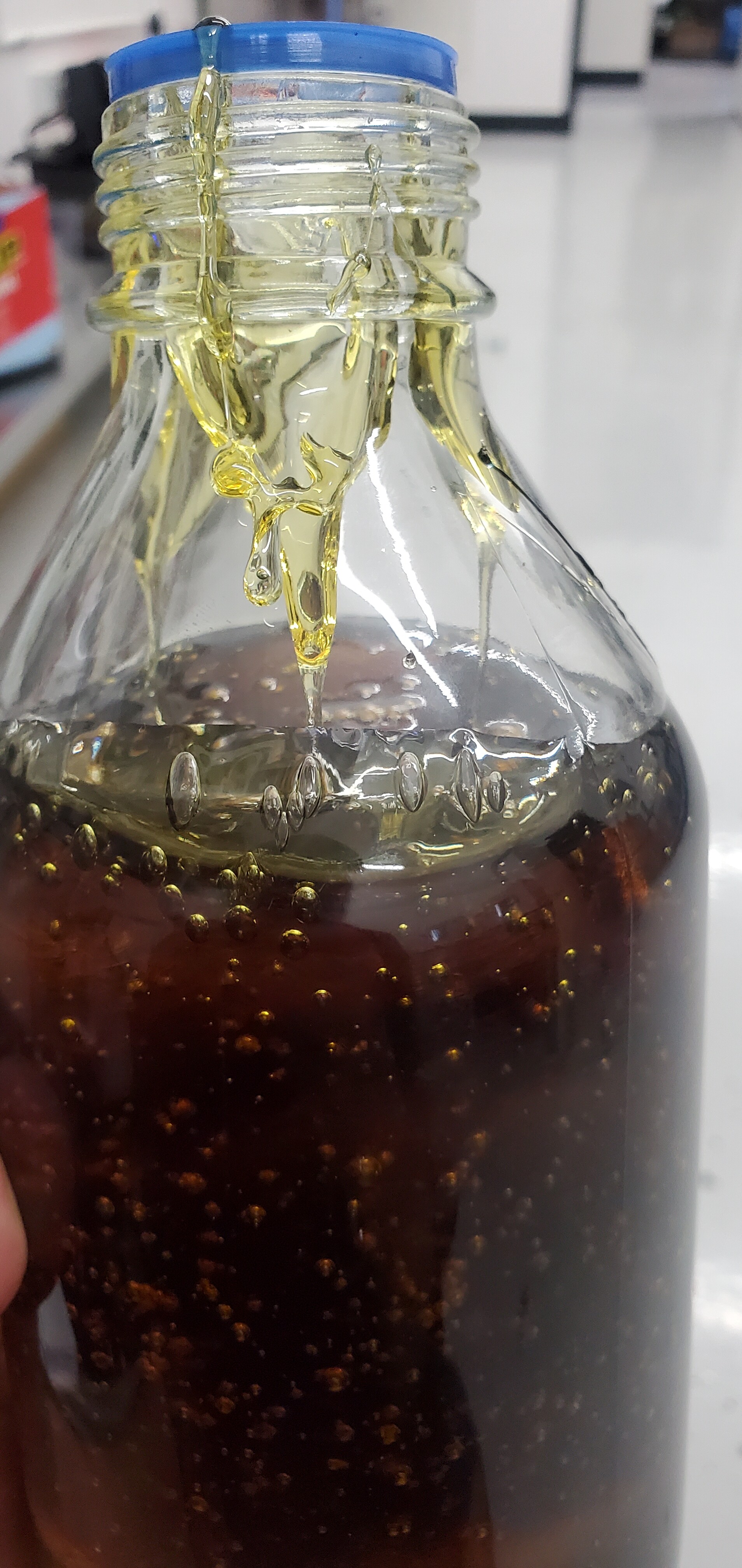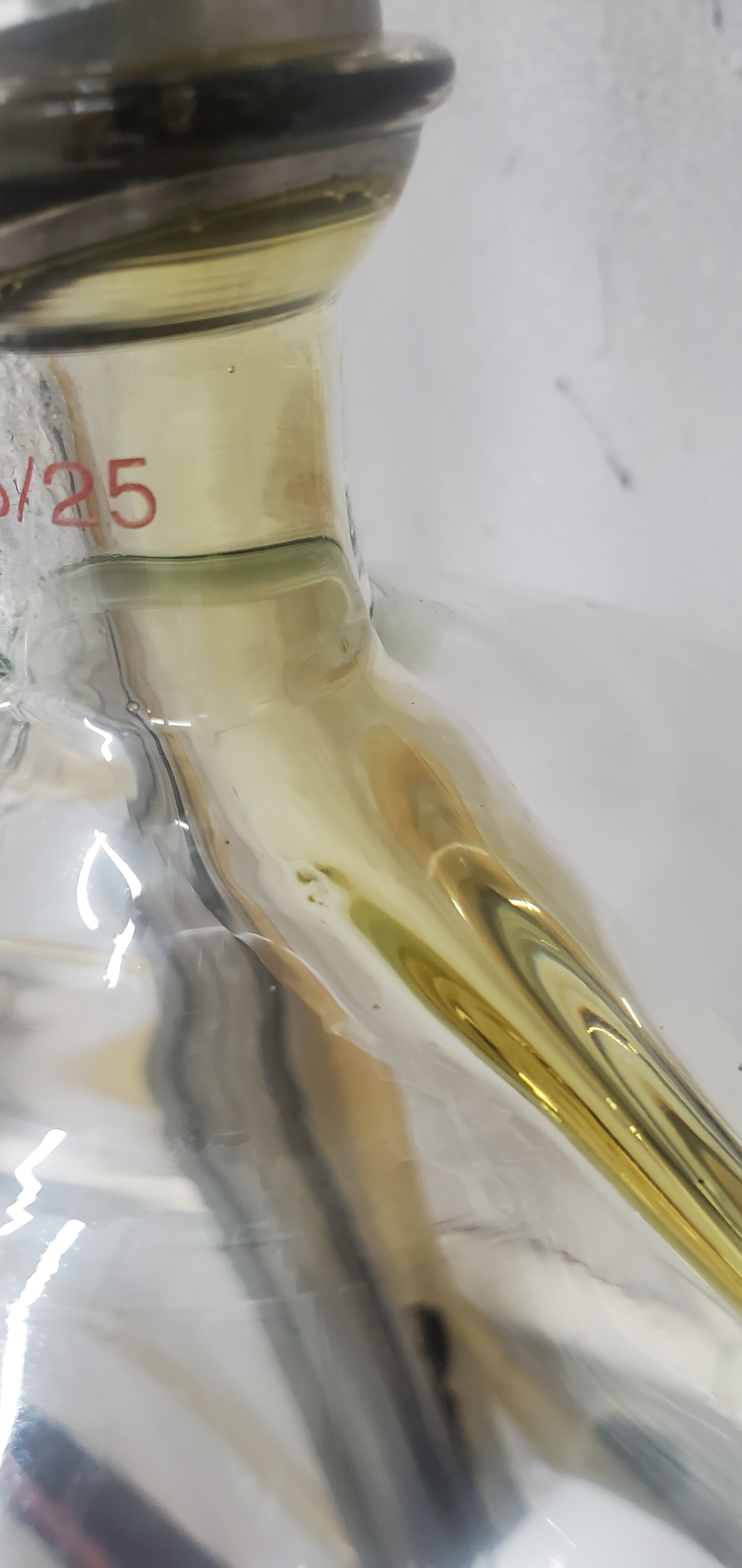 Hey everyone. So I got the red streak out and it looked good coming down out the wipe film, once it’s all collected in a bottle it gets dark. Weird. But I’m guessing because I don’t use a glass reactor before sending it to the wipe film?