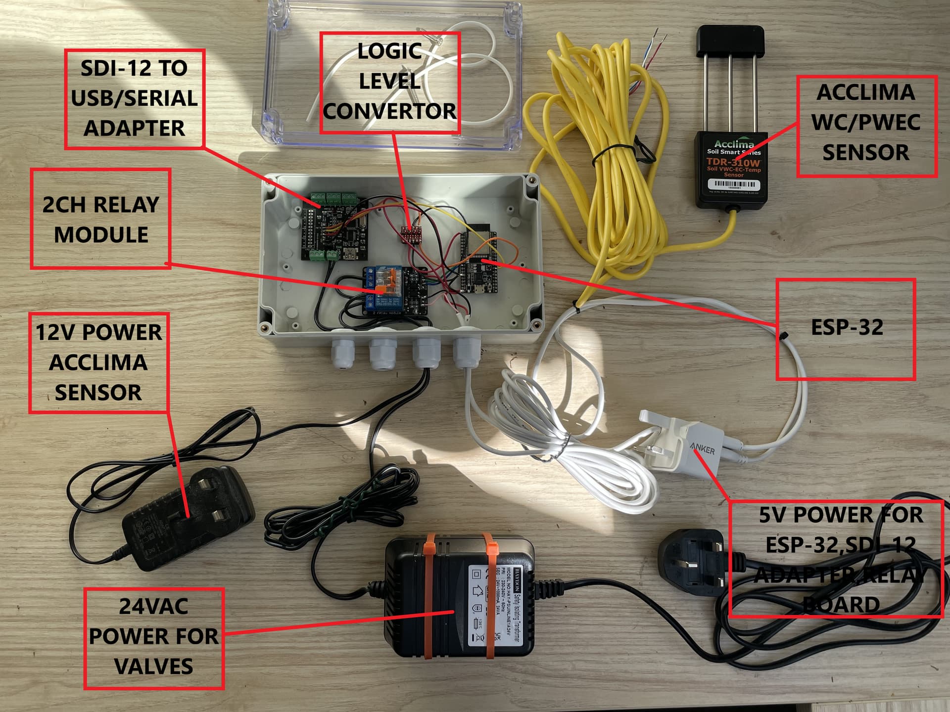 i had to use three different power packs for the build because the esp-32, relay board, and dr liu’s adapter want 5v, the acclima sensor needs 12v, and the irrigation valves need 24vac. this could be tidied up with a dedicated bit of circuitry like growlink have, but that was above my current knowedge level.