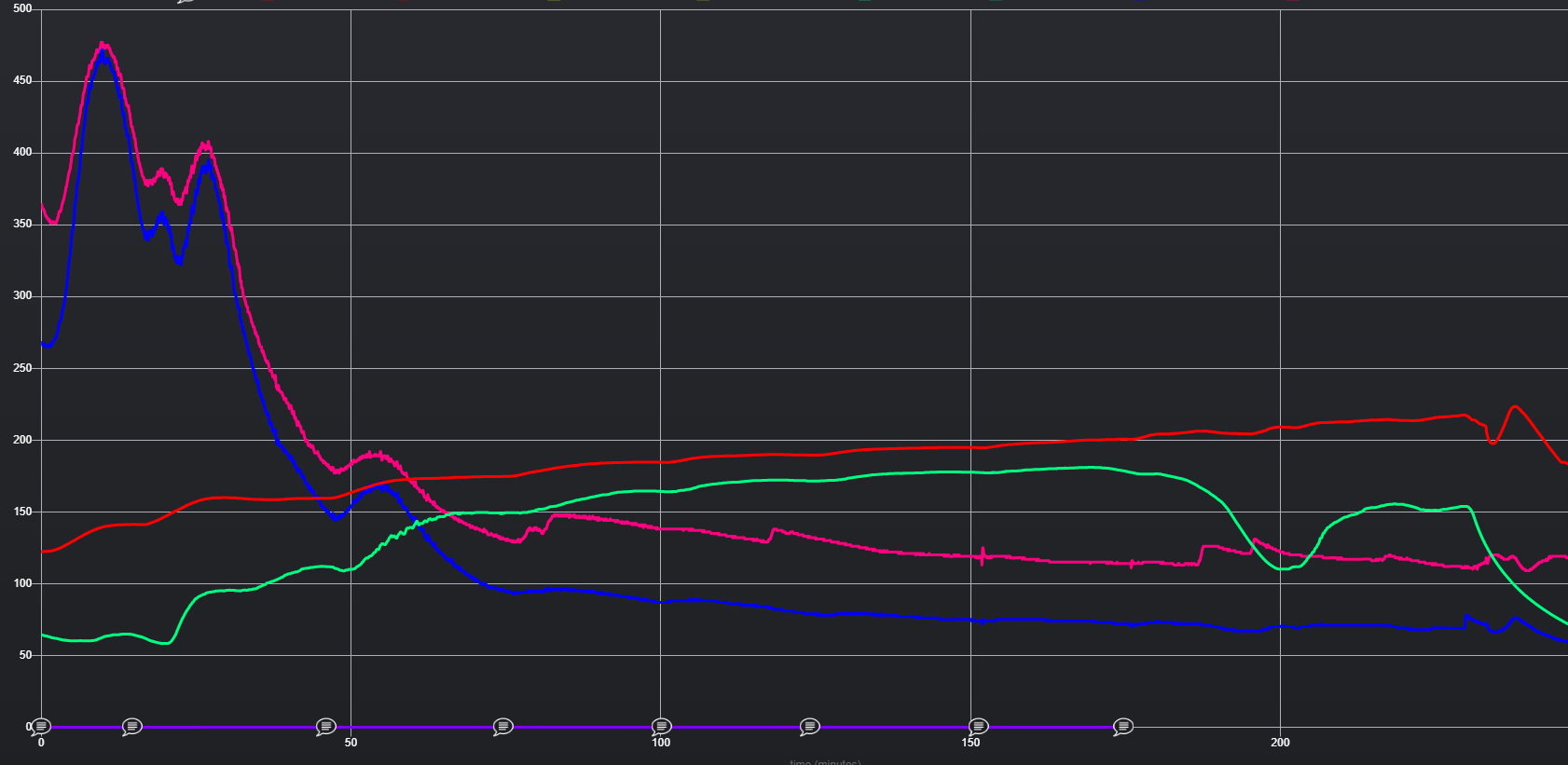 I start with a small amount of filtered, decarbed crude, at around 200g as I’m still at my R&D stage. I preheat the oil to 80c and then poor it into the boiling flask (which is also preheat). I set the first setpoint to 120C and from their increase the temps slowly and gradually till I hit 200c. Below is the graph of the whole process: