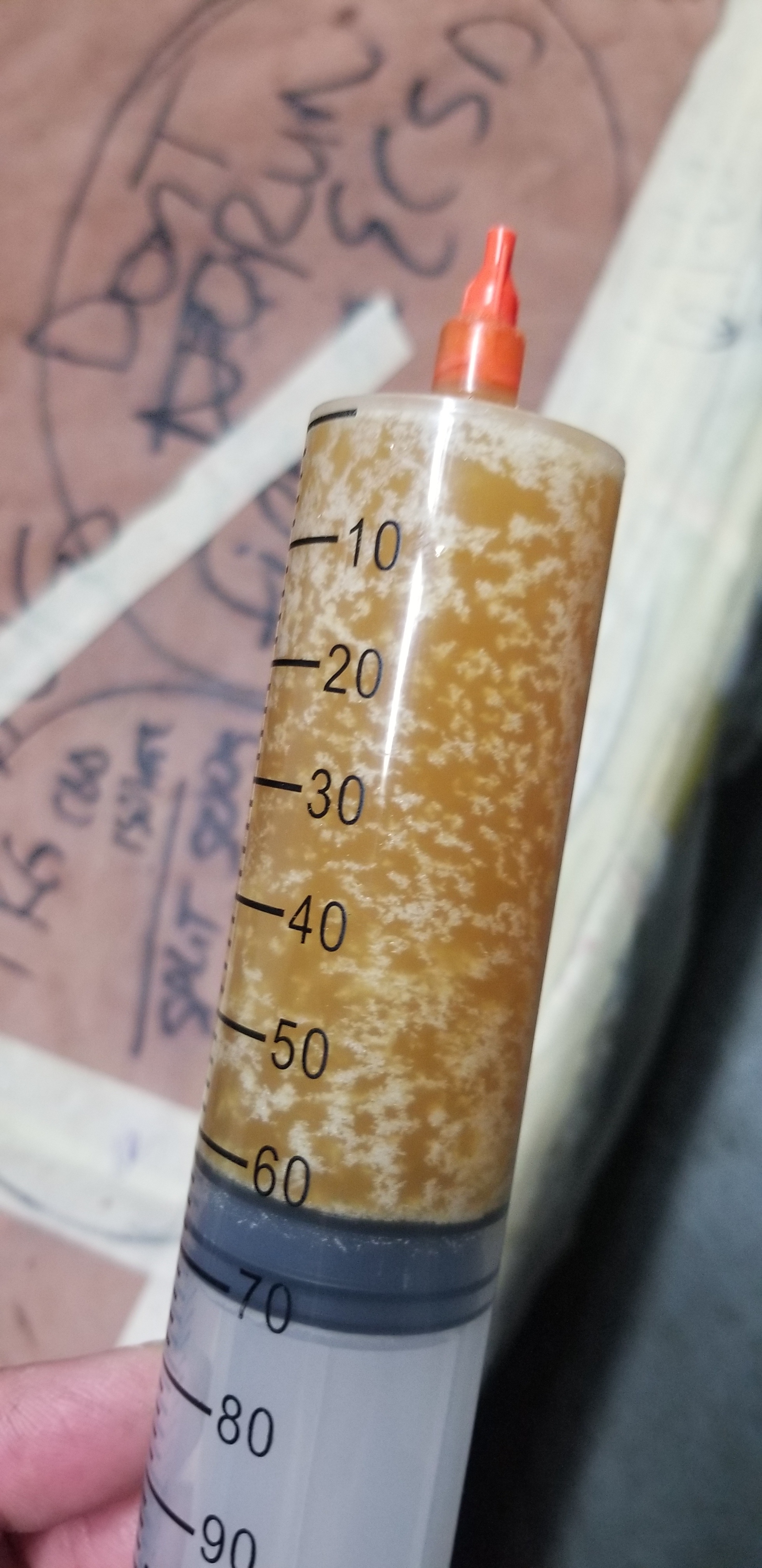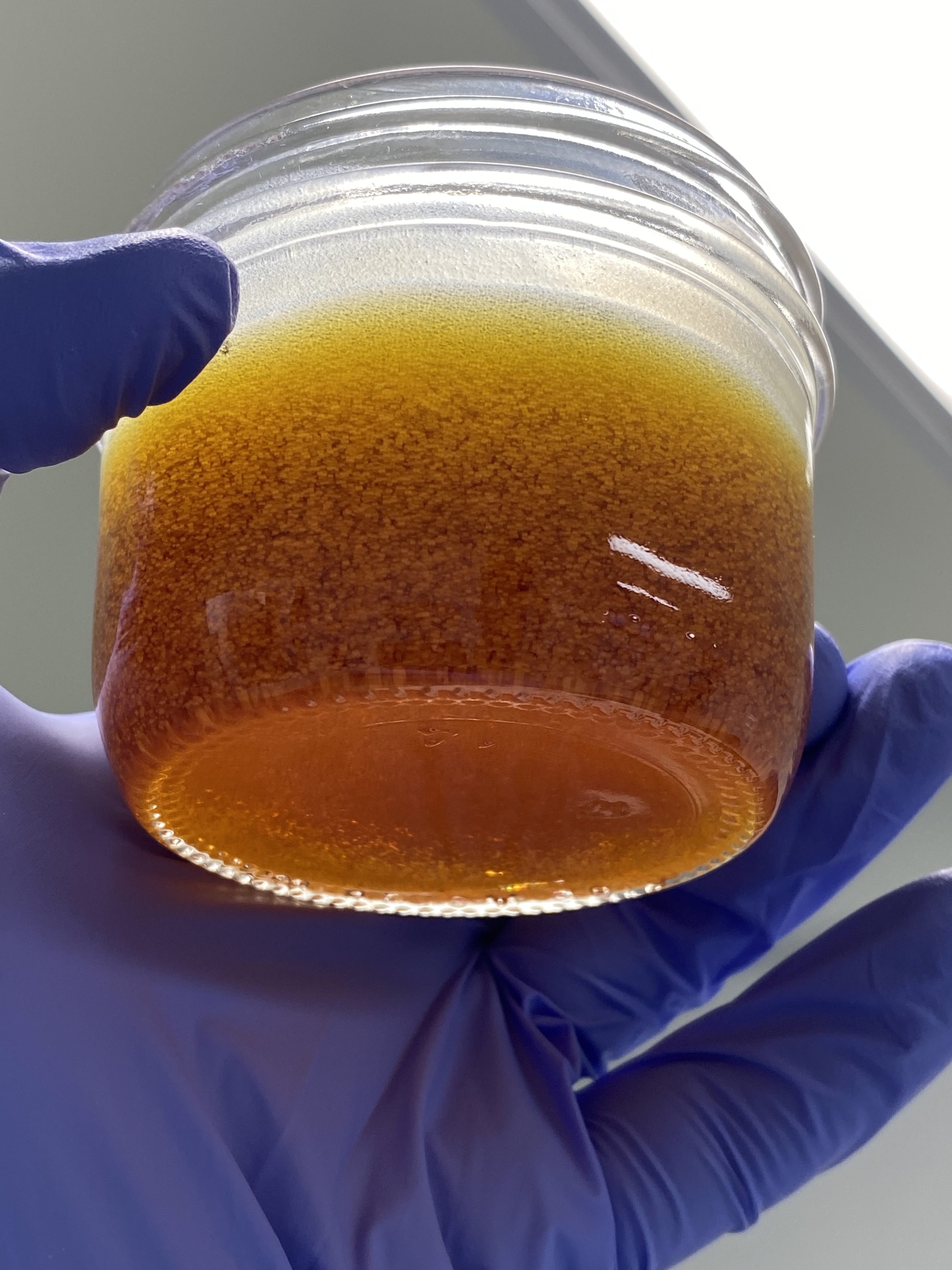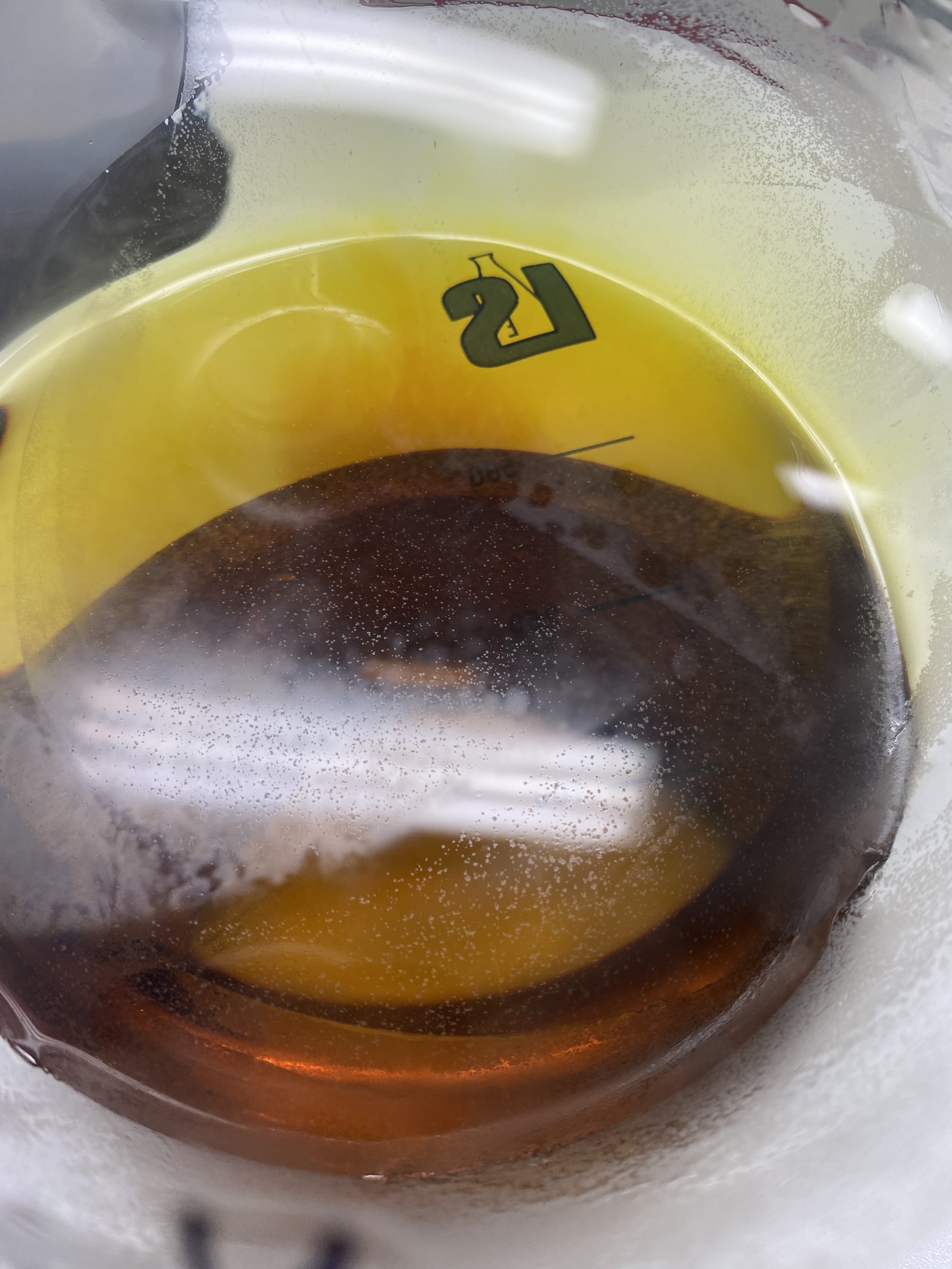 And here is another one from couple days ago. This is after the 1st pass distillation. After 2 days I can see some crystal like stuff forming on the surface of the oil and nothing under as you guys can see in the photos below: