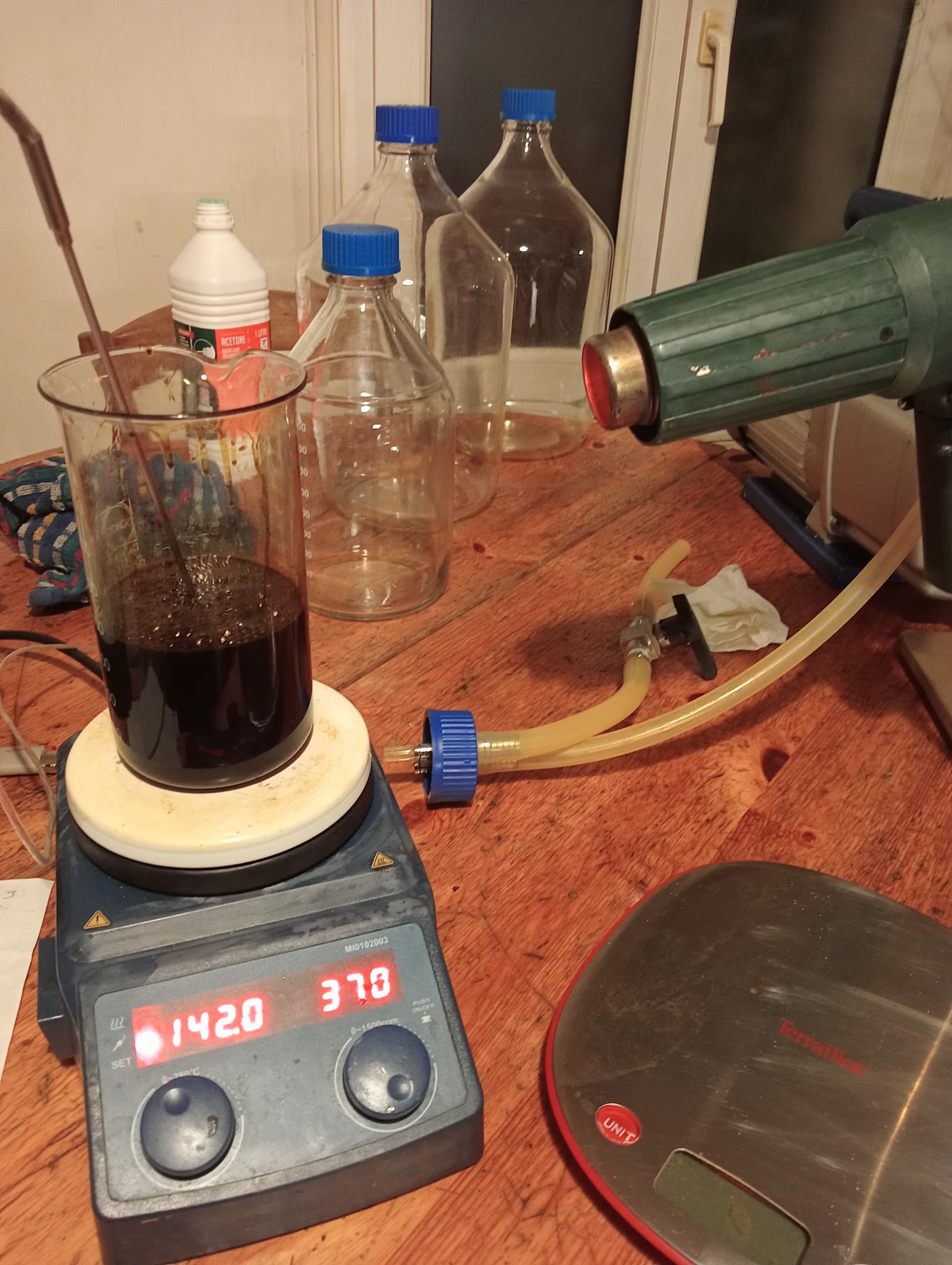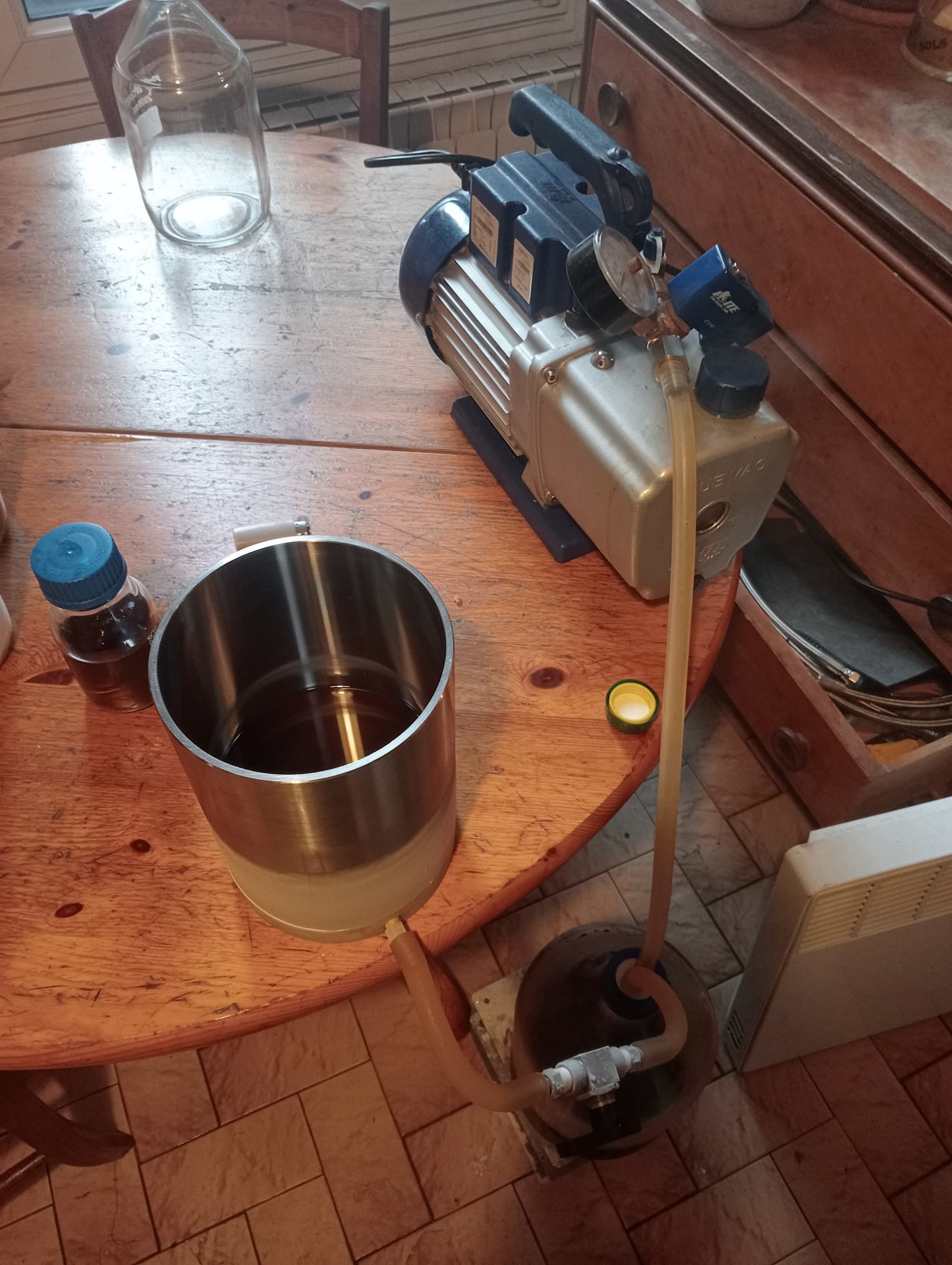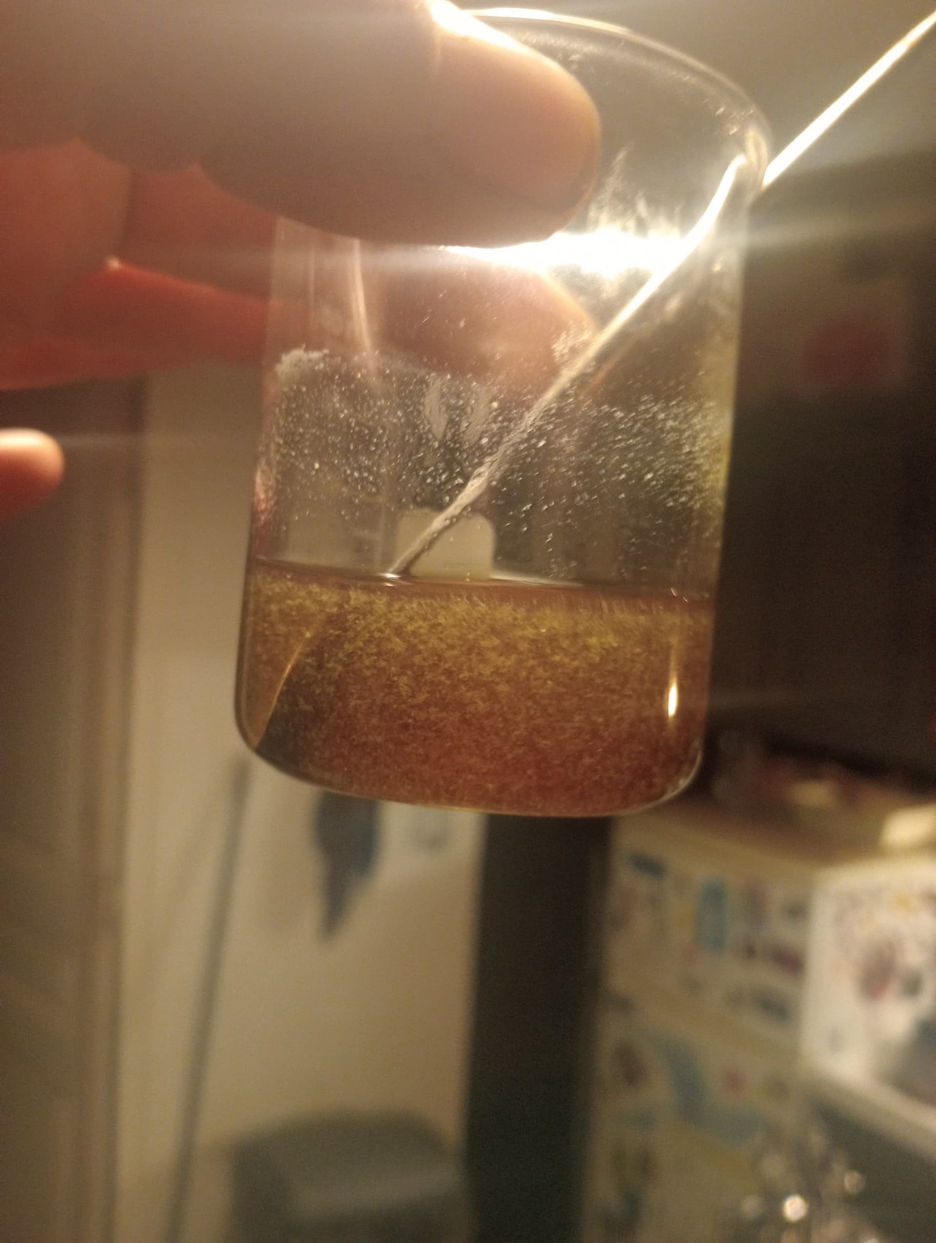 I have been working for several days to properly clean this dissolved hashish. fats are becoming less and less numerous. I will be finished soon. the solute becomes increasingly clear and has a slight red tint. I am working at the same time on cleaning a bho in ethanol. ethanol with cold is less liquid with a freezer at -85°. n-heptane remains fluid. I am very happy to no longer work with glass filters with frit. the last grease and wax are very fine and I work with a fine pore filter paper
