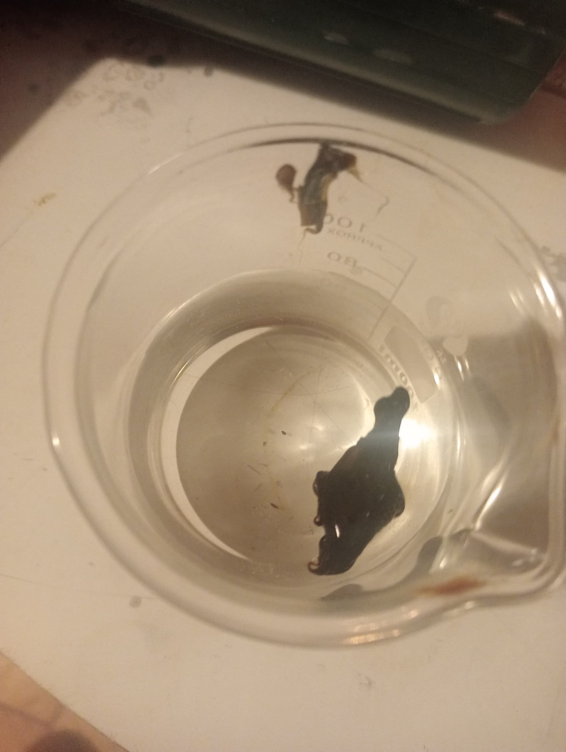 once these fats are separated then clean the solvent with the rotovap, I pass the material at 130° to eliminate the remaining solvent as best as possible. I then took two small samples which I placed in water and in ethanol. the material does not solubilize in water. it solubilizes in ethanol and creates a separation of fat without even cold