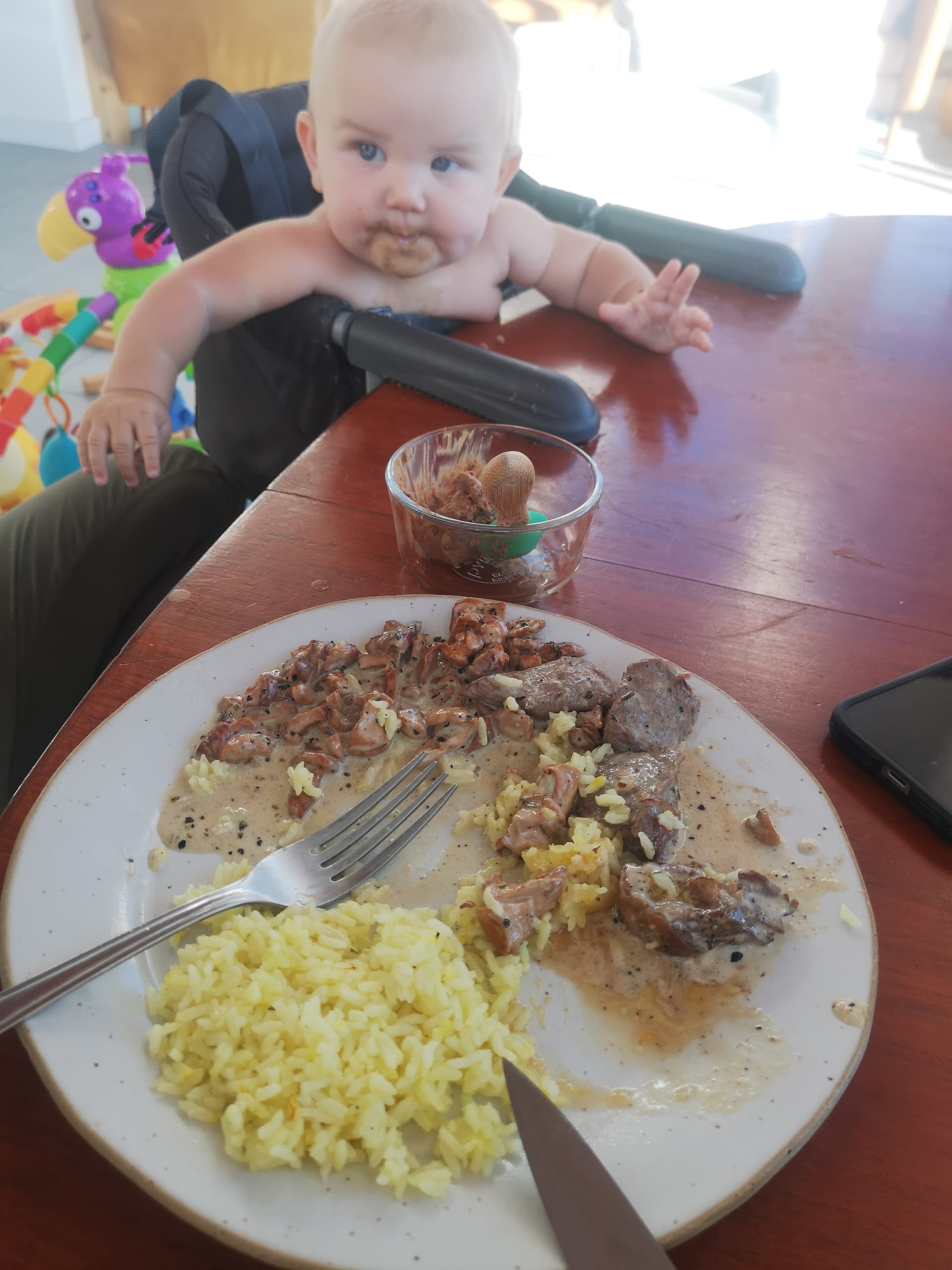 Chanterelle cream sauce, saffron rice, seared beef âstew meatâ