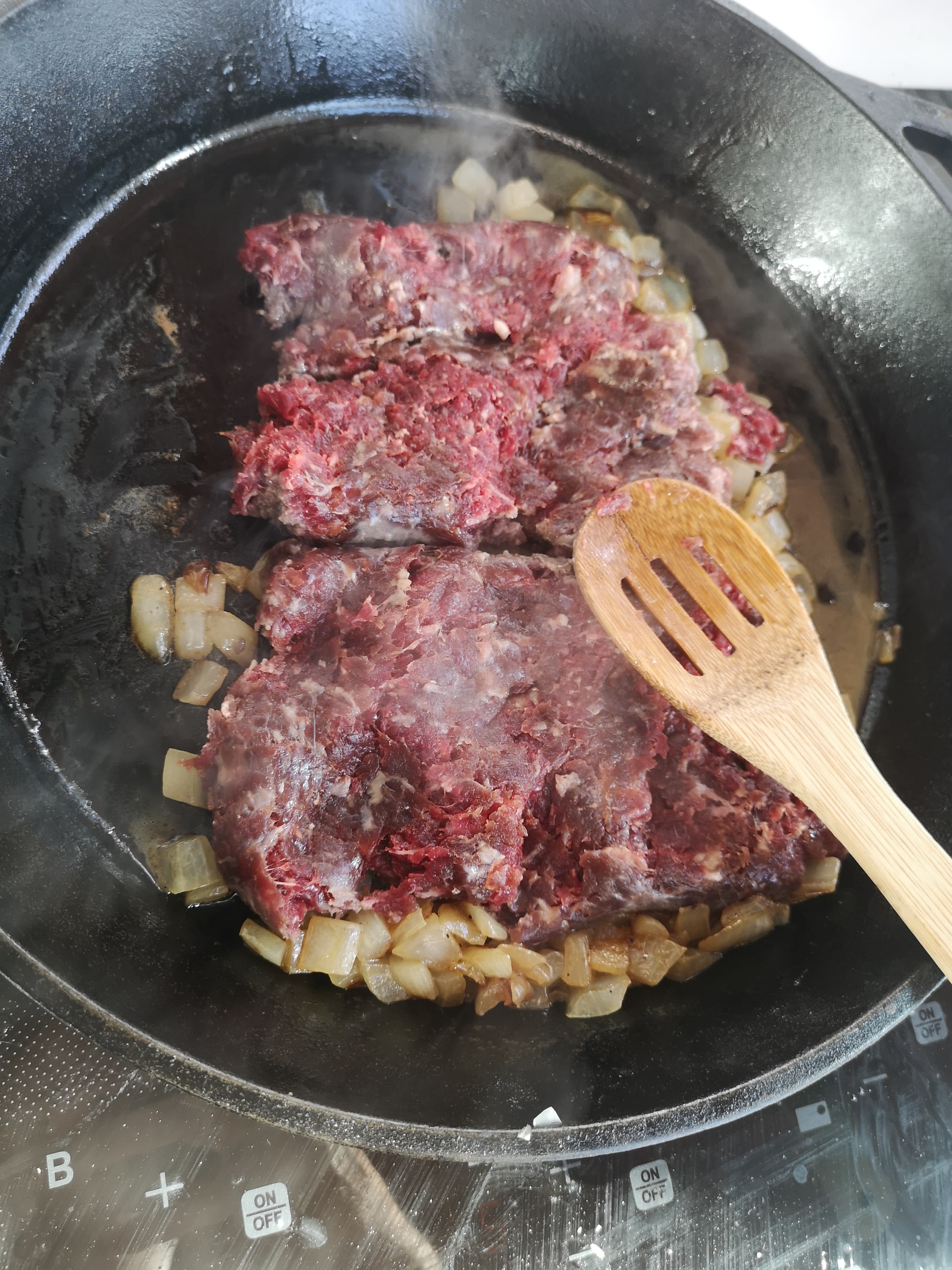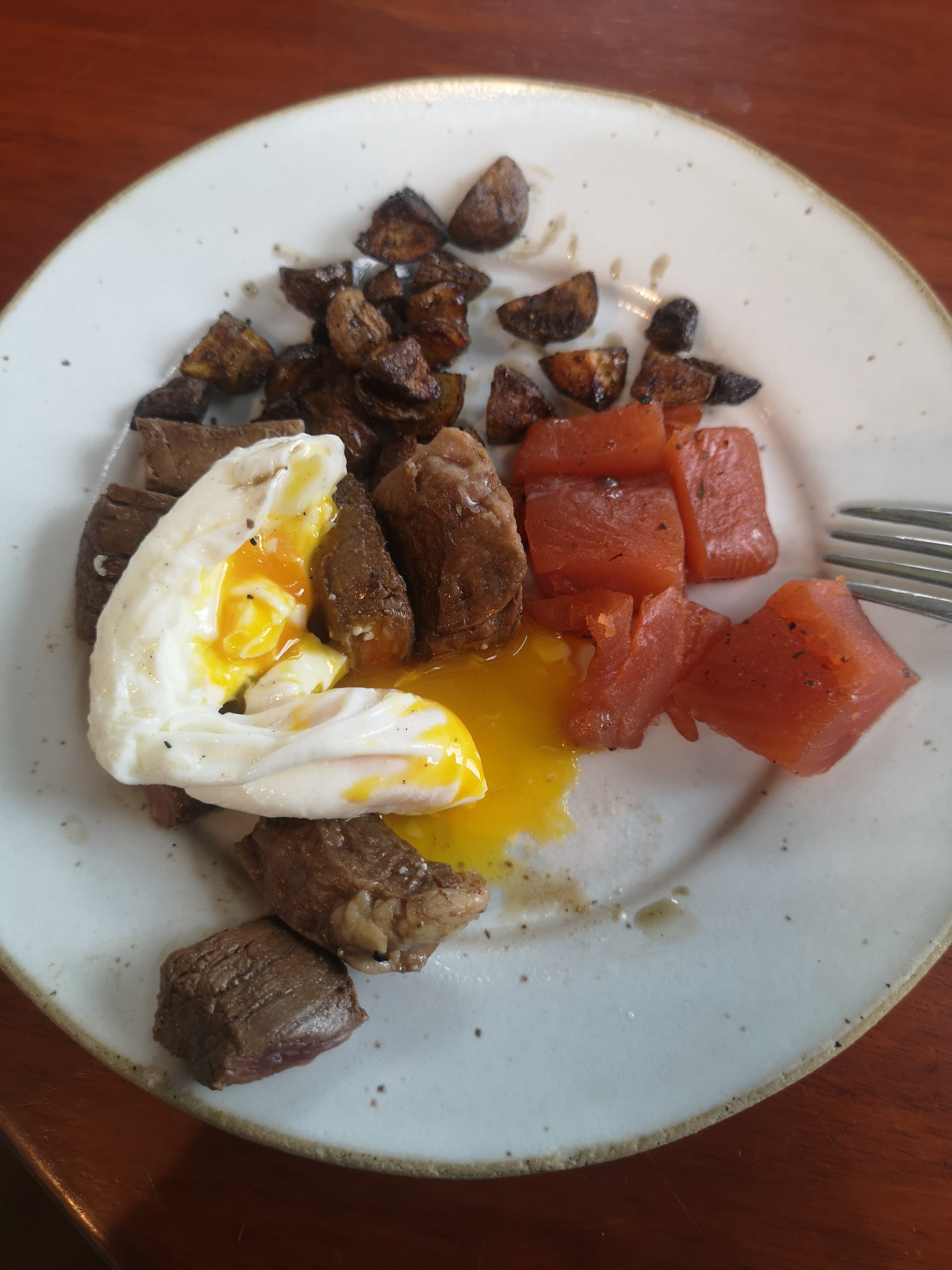 More beef stew meat, poached egg from our birds, salmon lox from an ocean chinook I caught a couple weeks ago, taters from the garden