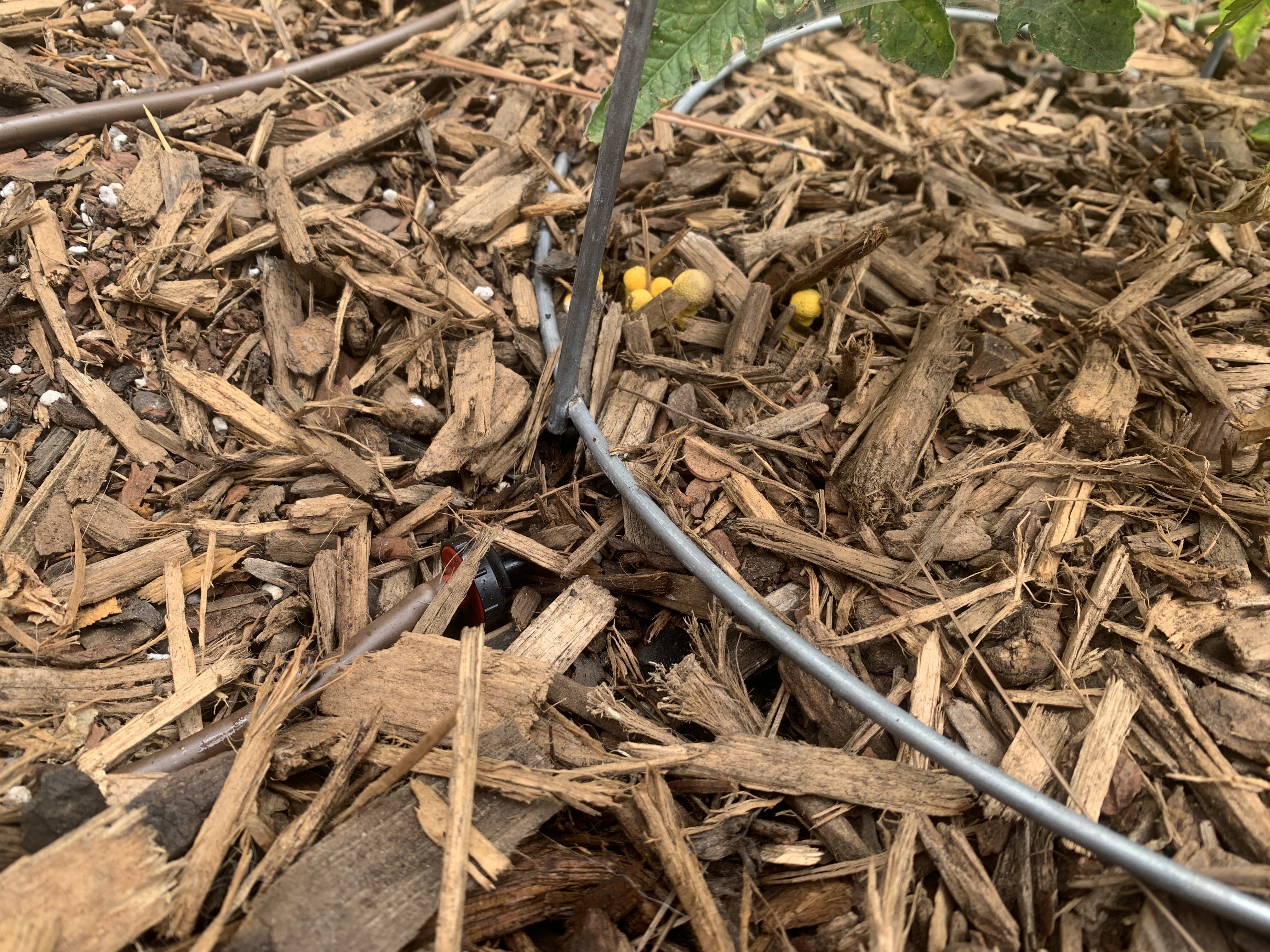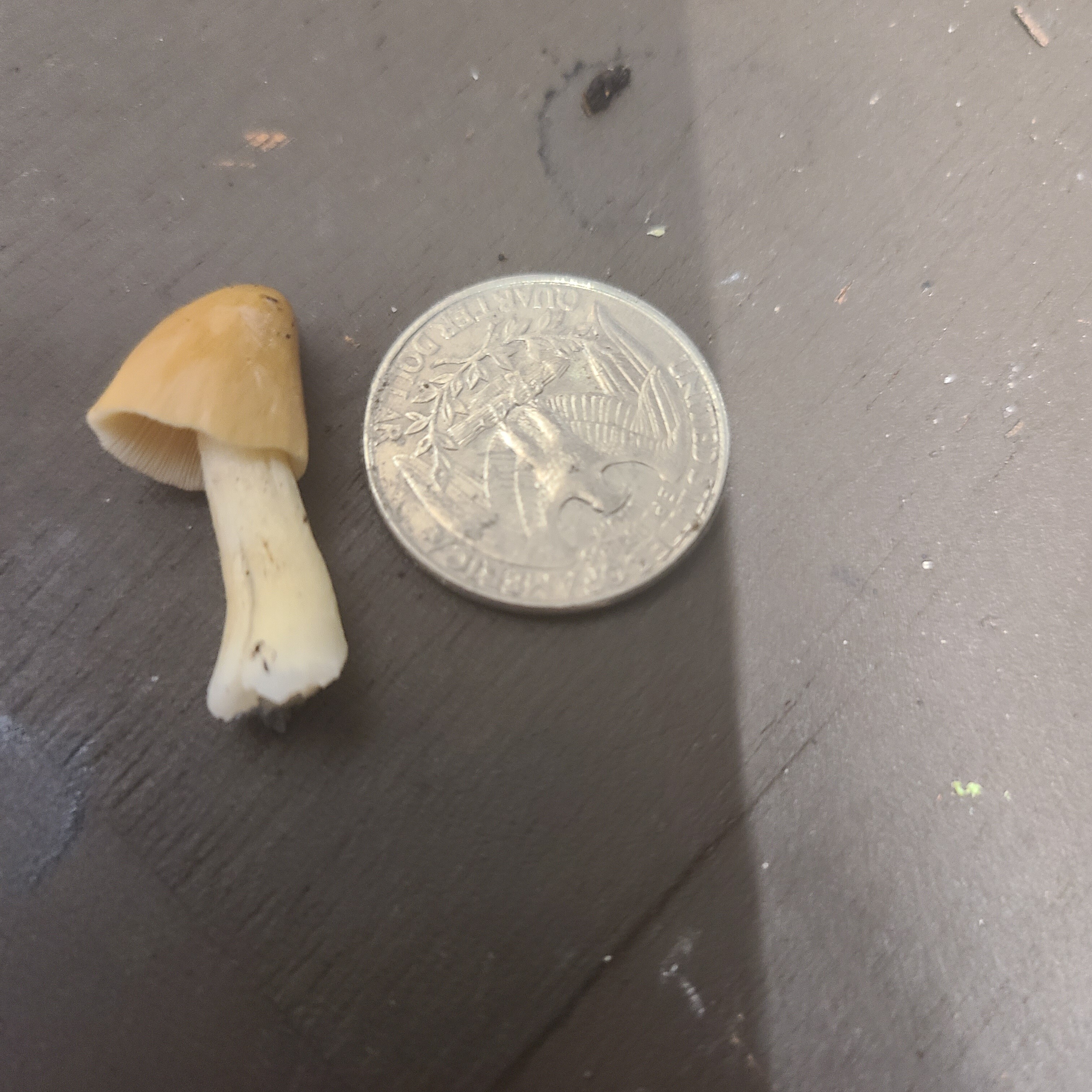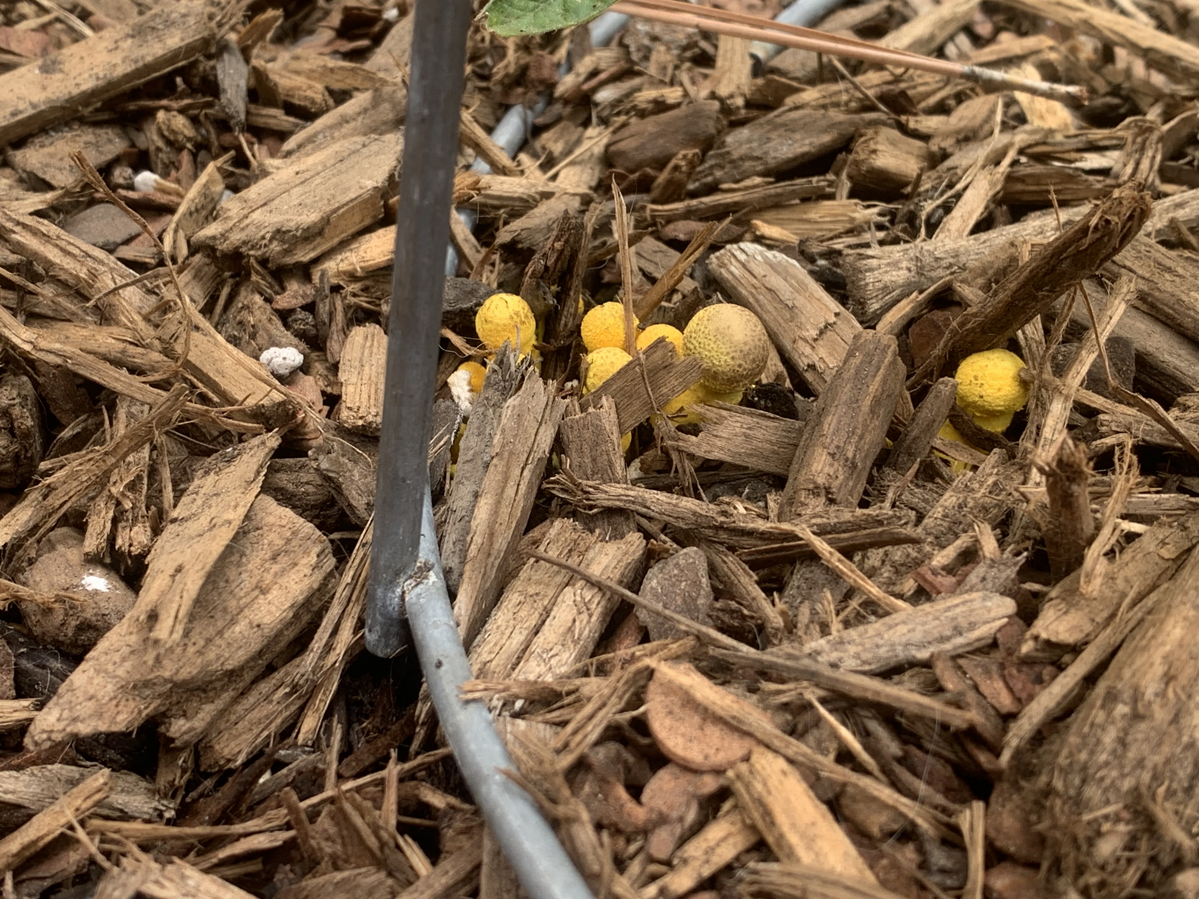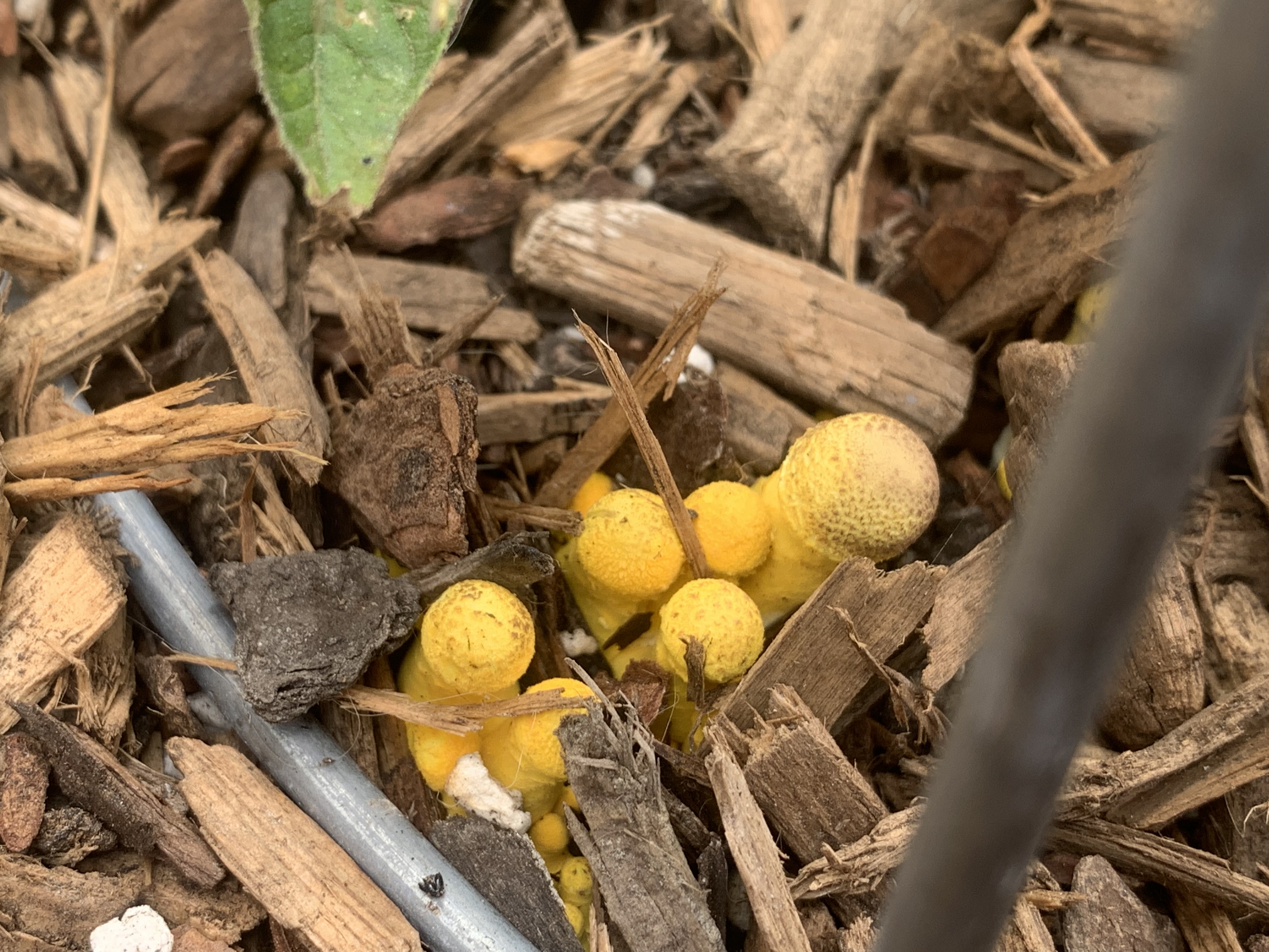 Assuming non edible Leucocoprinus birnbaumii? Maybe someone can help me in identifying. Popped up next to my tomatos.