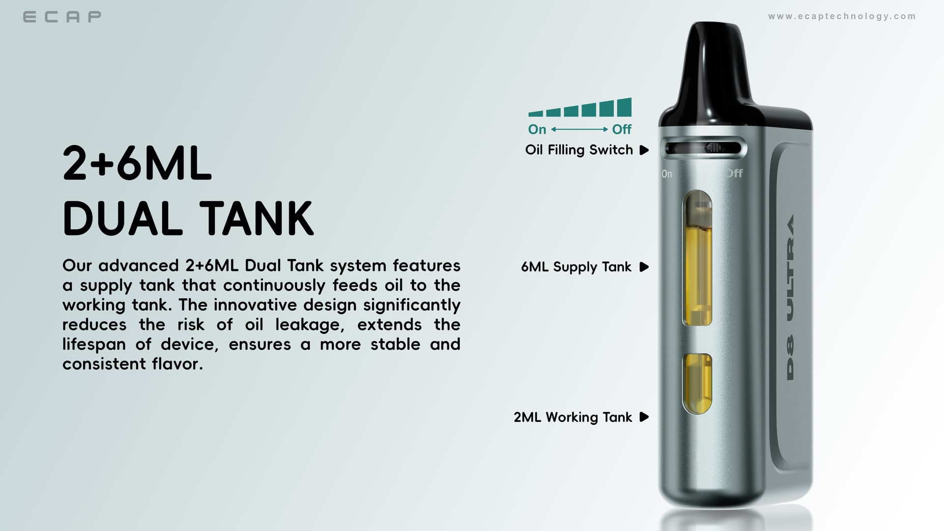 the new device is 8ml, have dual tank, 2ml +6ml, 2ml is the working tank, 6ml is the supply tank, when there is no oil in the working tank, just turn on the button to supply the oil