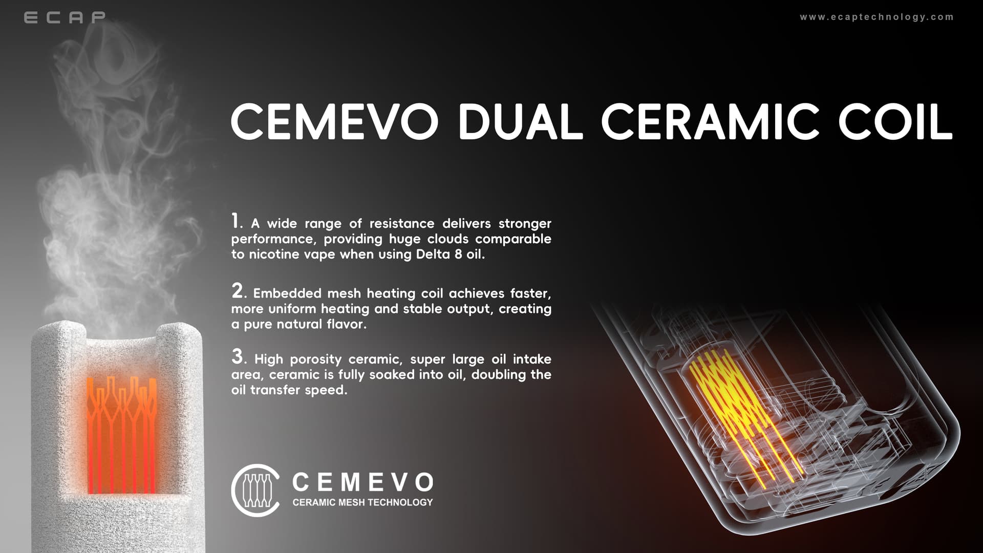 Due to provide client more big vapor, we are using one big ceramic coil, which is using cemevo tech, using two heating elements, to give clients more big cloud smoking experience .