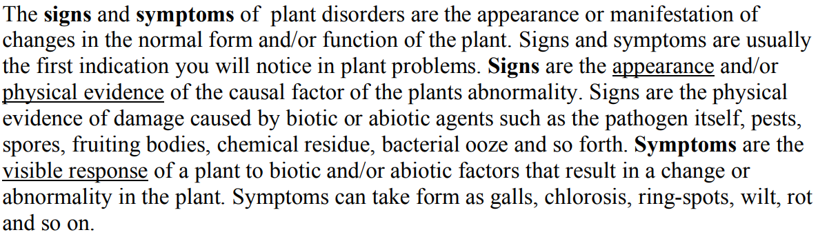 However, note that in medicine, “symptom” and “sign” are typically (but not always) defined as subjective and objective, respectively. The patient (in our case, grower) notes symptoms while the physician (or plant pathologist) notices signs.