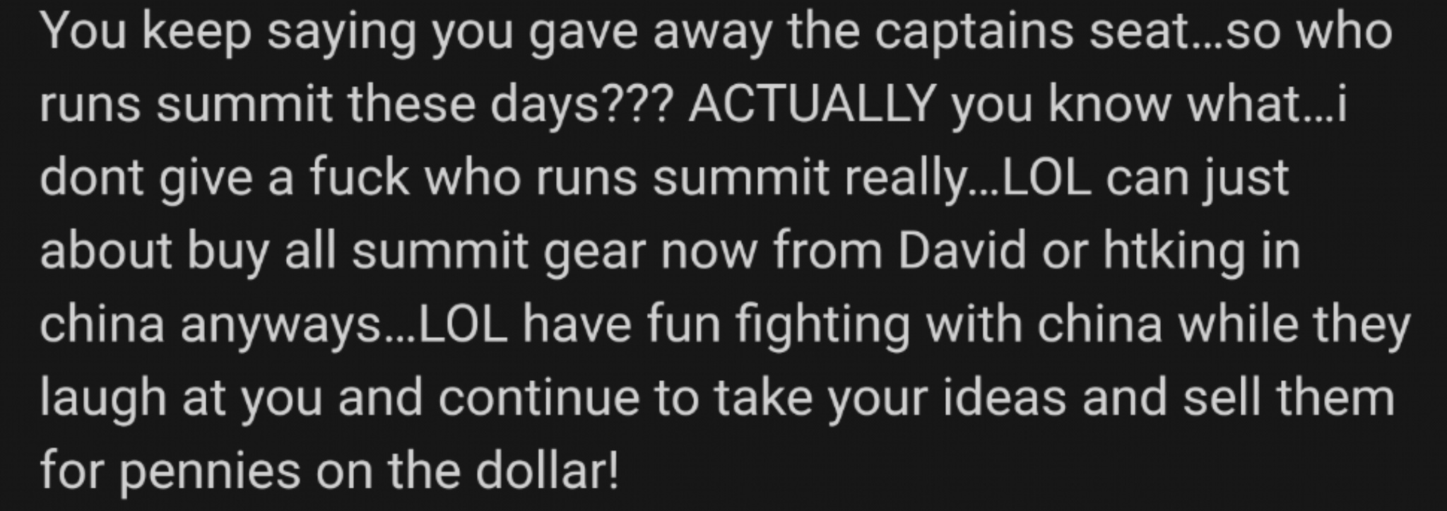 You keep saying you gave away the captains seat…so who runs summit these days??? ACTUALLY you know what…i dont give a fuck who runs summit really…LOL can just about buy all summit gear now from David or htking in china anyways…LOL have fun fighting with china while they laugh at you and continue to take your ideas and sell them for pennies on the dollar!