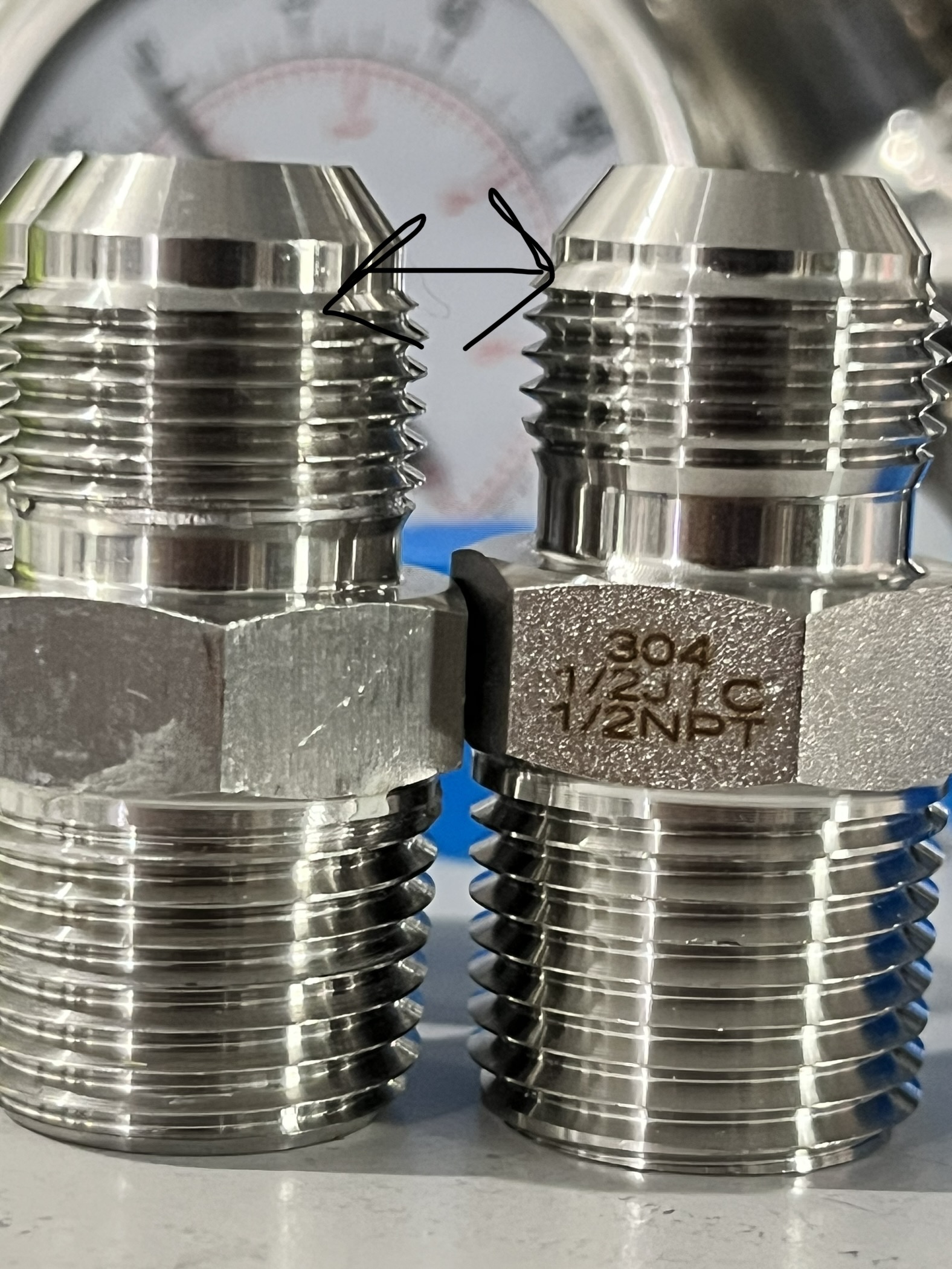 The old flares (left) that came with my system are raised a bit more at the 37 degree than the new ones I got today. (right) The new flare also seats all the way into the thread.