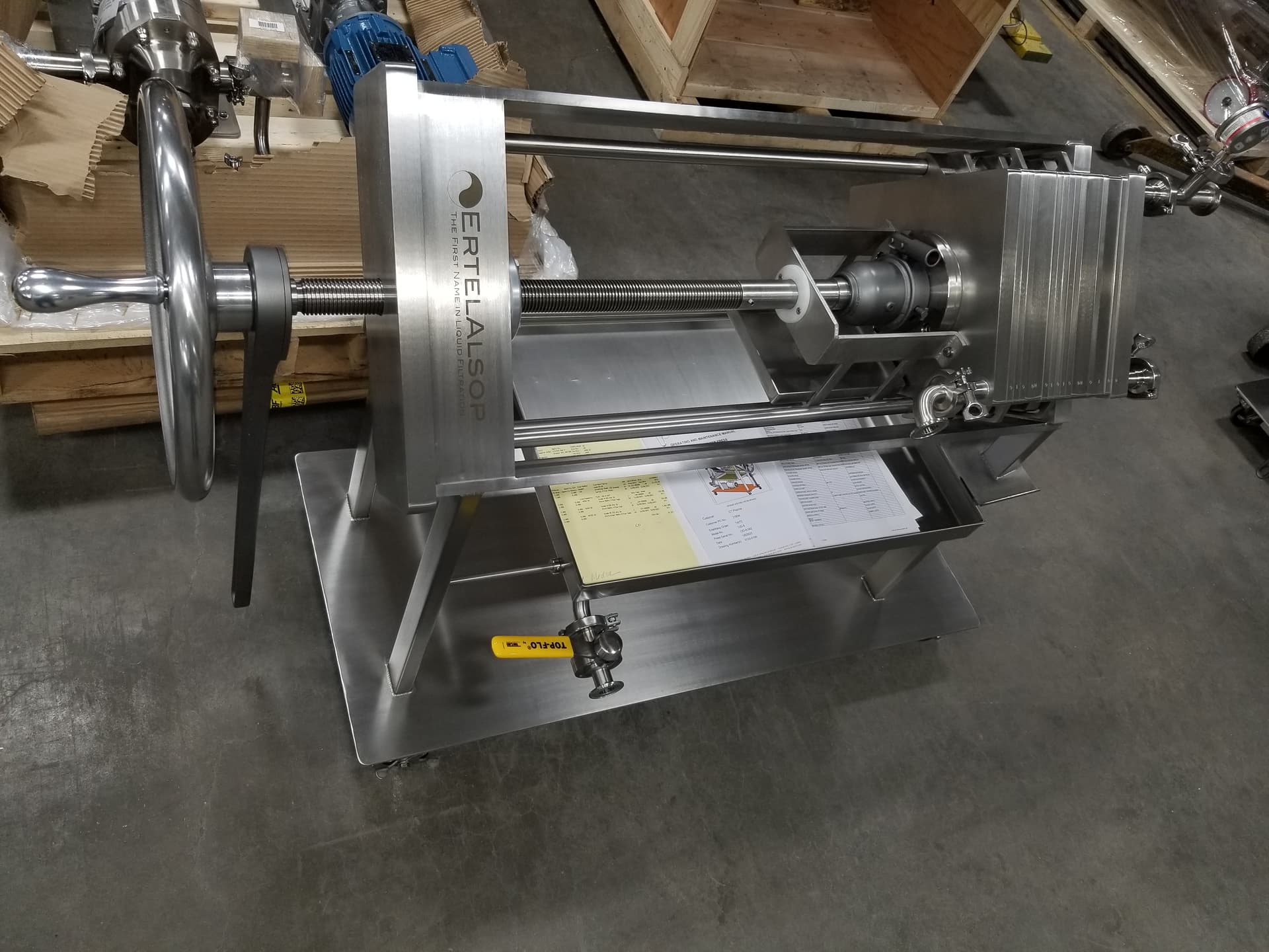 @jws66m ErtelAlsop manufactures true plate and frame filters up to 36" square. Unlike the pig filter, which uses filter paper, our plate and frame filters utilize depth filter media (same filter media a lenticular uses). We have a good number of labs utilizing this technology as it can do 2 or 3 stages of filtration in the same pass, plus the filter media is much cheaper in sheet form as compared to lenticular form. The photo attached is a 12inch diamond model running 4 stages of filtration in a Connecticut lab. It utilizes 1" inlet frames on the first filter bank to capture biomass from centrifuge (acting as a pre-filter) and goes through a 1 micron depth media. In the second back it uses a high efficiency activated carbon, and in the 3 filter bank it uses 0.45 depth media impregnated with diatomaceous earth. Additionally, our filter media impregnated with Carbon Chemistryâs T5 could also be used in one of the stages.
