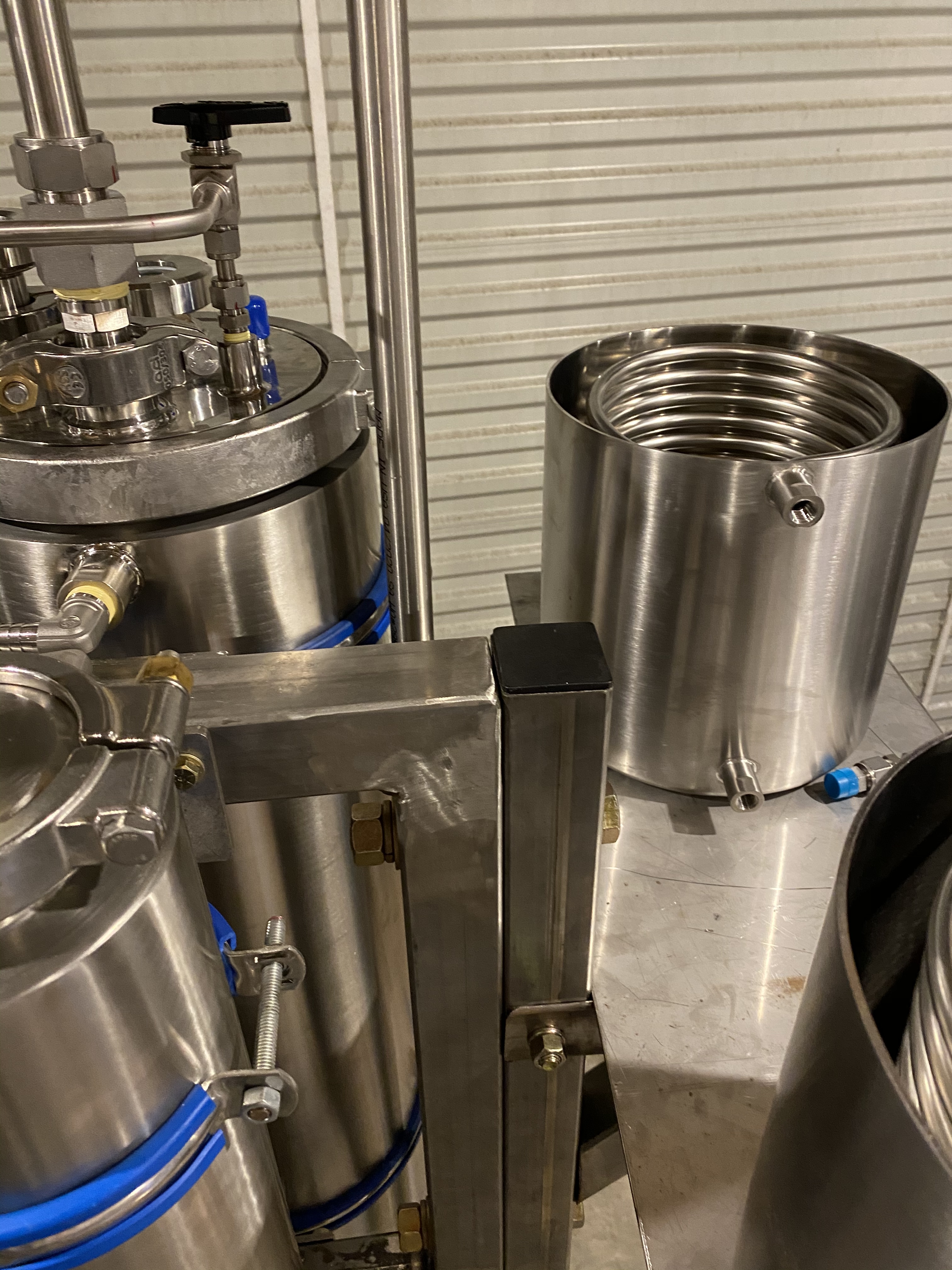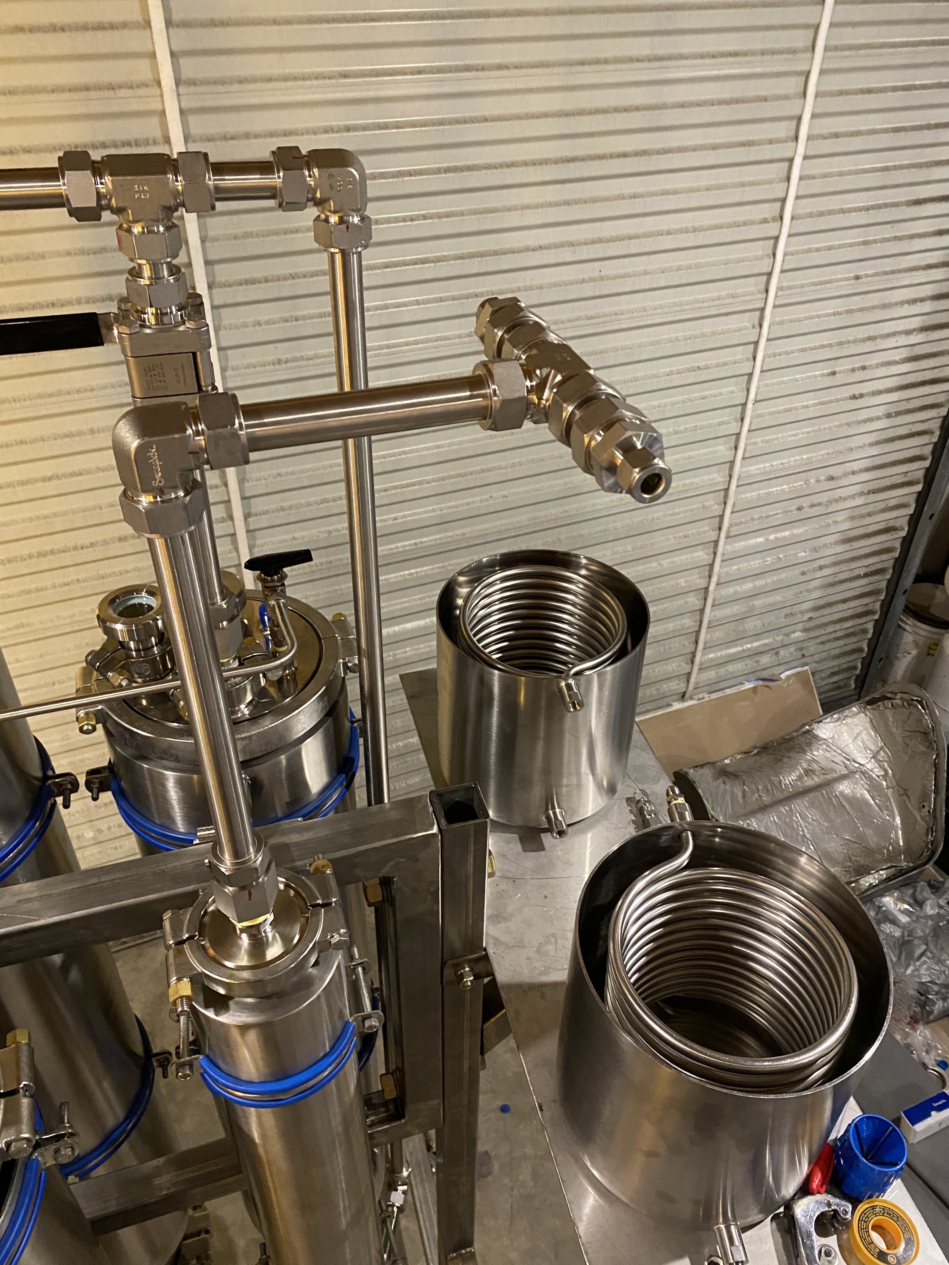 Itās basically a 1/2ā cooling coil (its 42ā long x 8ā wide) and one outlet goes to the March ethanol pump, which delivers to the process. The other inlet, is hard-lined into a tri-clamp 3ā sight glass, which on top has a 30PSI swagelok PRV and gauge, and then hard lined coming from the process. It fits inside a 12ā x 48ā tri-clamp column. If my paperwork is correct, it should work well.