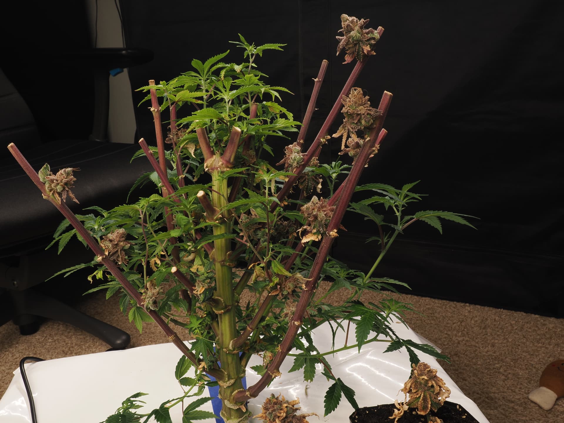 When I harvested the plant I didn’t cut it down. I left about a dozen of the lower buds, no fan leaves other than the buds. I left it under light for 24 hours for 2 months before she started pushing new growth. Once she grows out more I’ll take a bunch of cuttings and run a full 4x4 of just her.