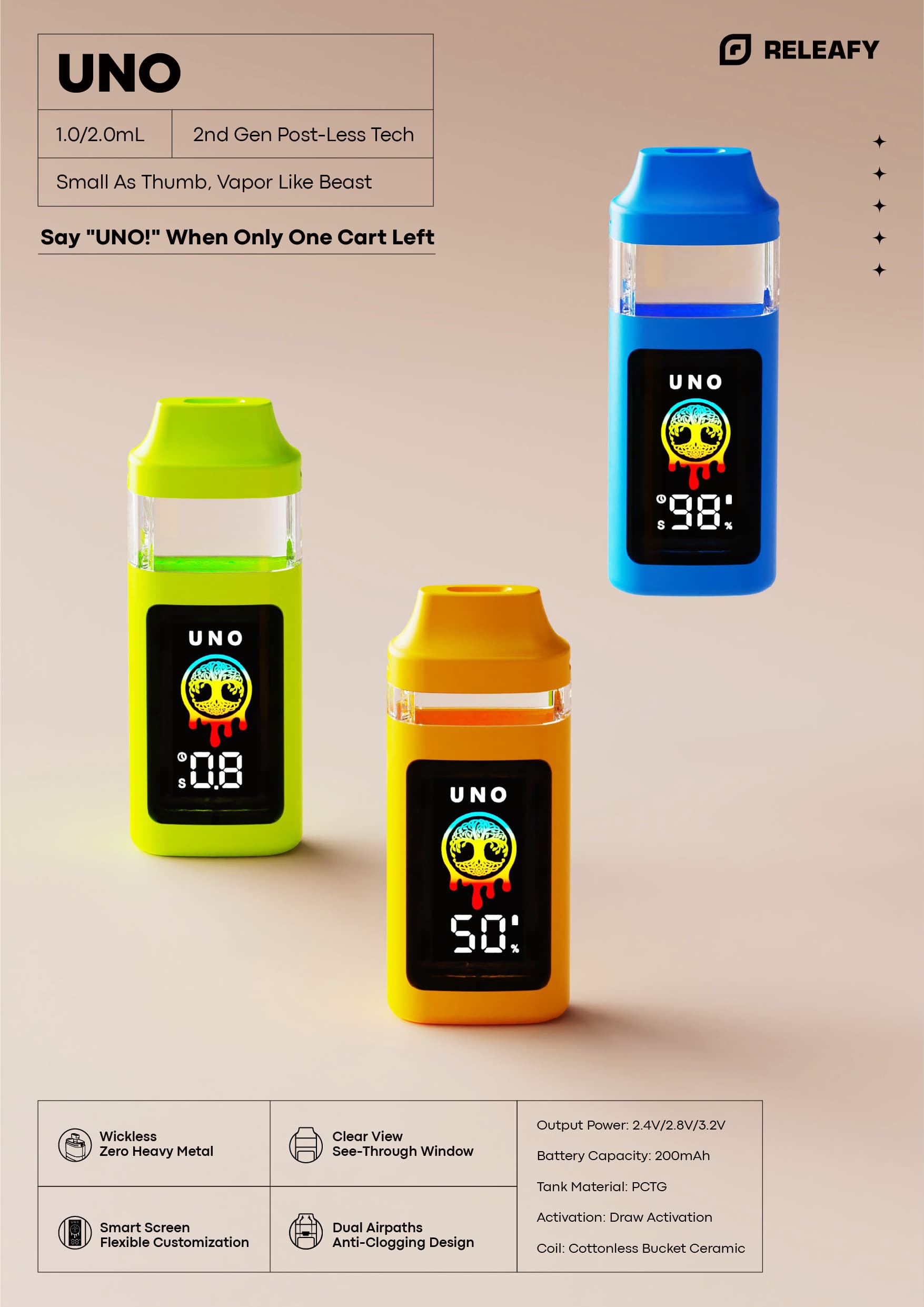 The 0.25–1.25ml plug vape offers the widest capacity range in its class. Its unique, compact design gives your device a competitive edge.