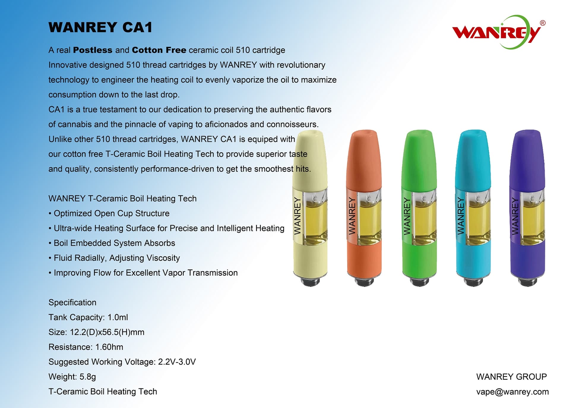 Unlike other 510 thread cartridges, WANREY CA1 is equiped with our cotton free T-Ceramic Boil Heating Tech to provide superior taste and quality, consistently performance-driven to get the smoothest hits.