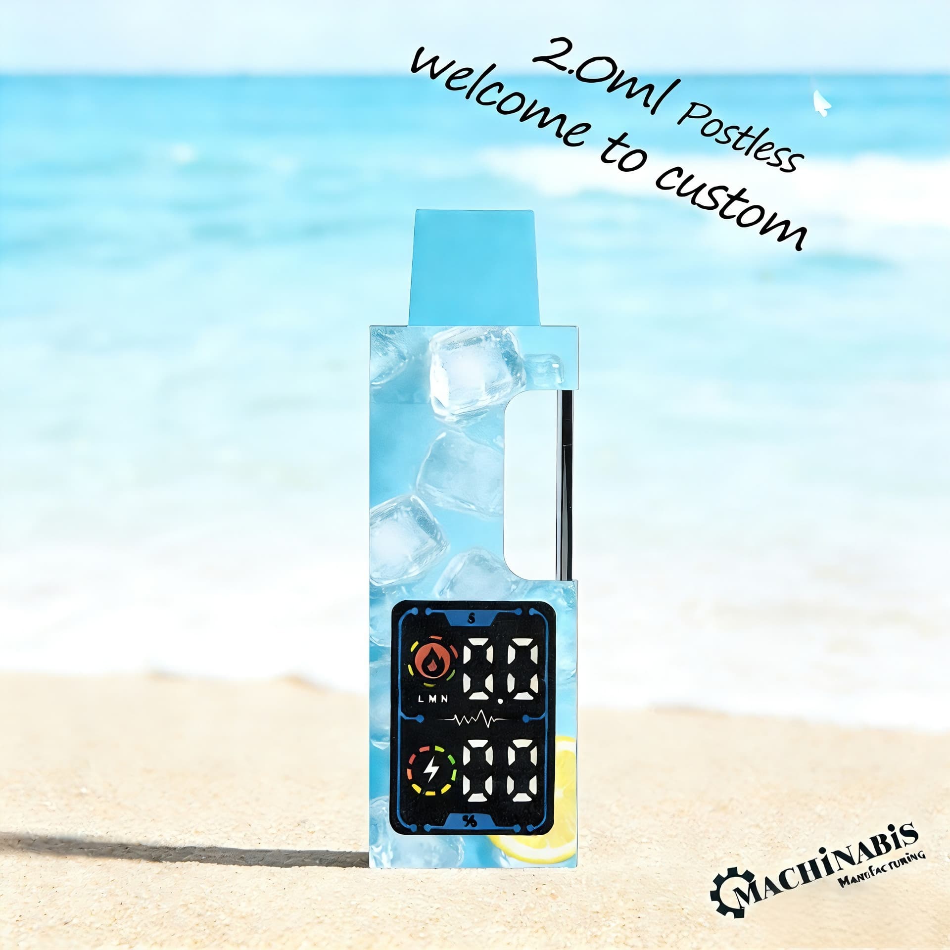 Our 2.0ml Postless disposable vape – fresh beach & icy design, sleek blue mouthpiece, and clear display for smooth, hassle-free sessions.