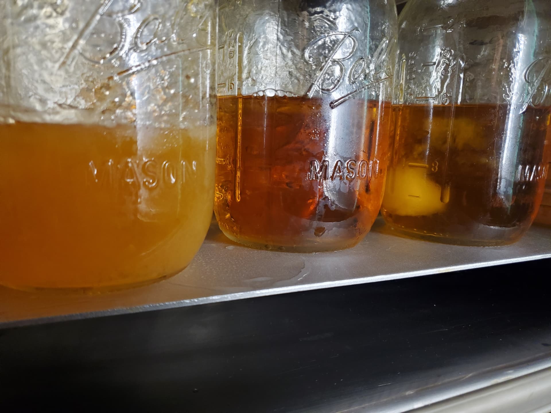 Jar on the left is offgassing and crashing out. I placed this jar in the warm oven last. Jar in the middle is sealed and has been in the warm oven for long enough to dissolve the clouds of precipitation. Jar on the right is sealed and is in the process of redissolving the precipitation but has been in the warm oven for less time. If these jars stayed sealed they would definitely blow the lid off.