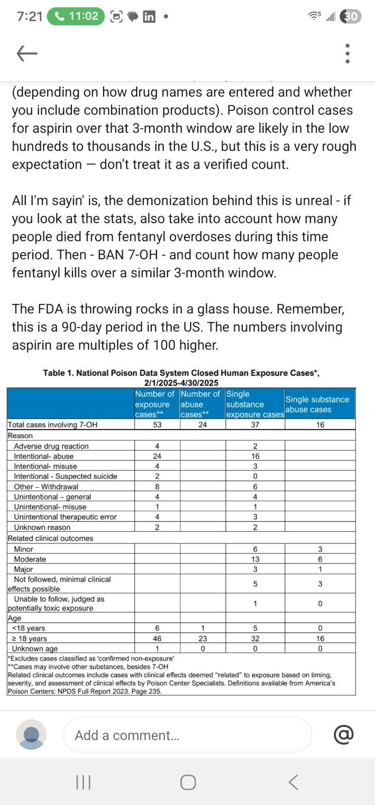 There are far fewer confirmed 7-OH-specific poison-control or fatality reports than Aspirin or Melatonin, but this is due to lower exposure numbers, not proof of lower inherent risk. Data on pure 7-OH remains sparse, incomplete, and confounded by mixed-substance products.