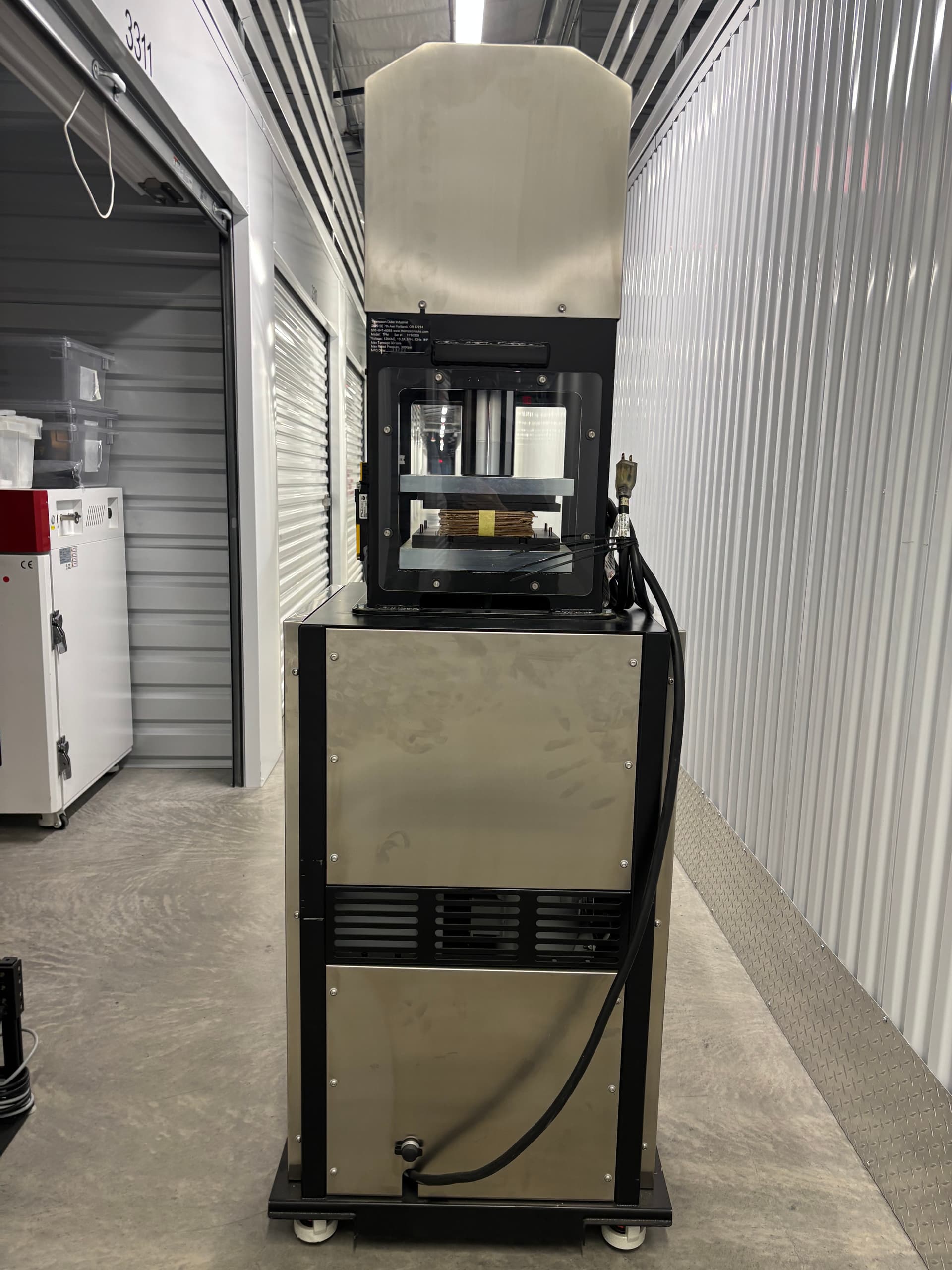 Automatic control with the ability to adjust between 1 and 30 tons of force in half-ton increments. Auto-locking safety door interlock and impact-resistant windows protect operators. Machine enclosure rests on casters with leveling feet for easy, safe maneuvering and securing. Very low maintenance system. Food grade hydraulic oil and stainless enclosure ensure easy cleaning and system management. The 120VAC hydraulics require no compressed air system.