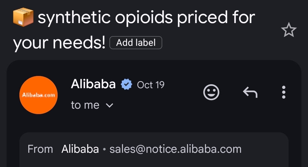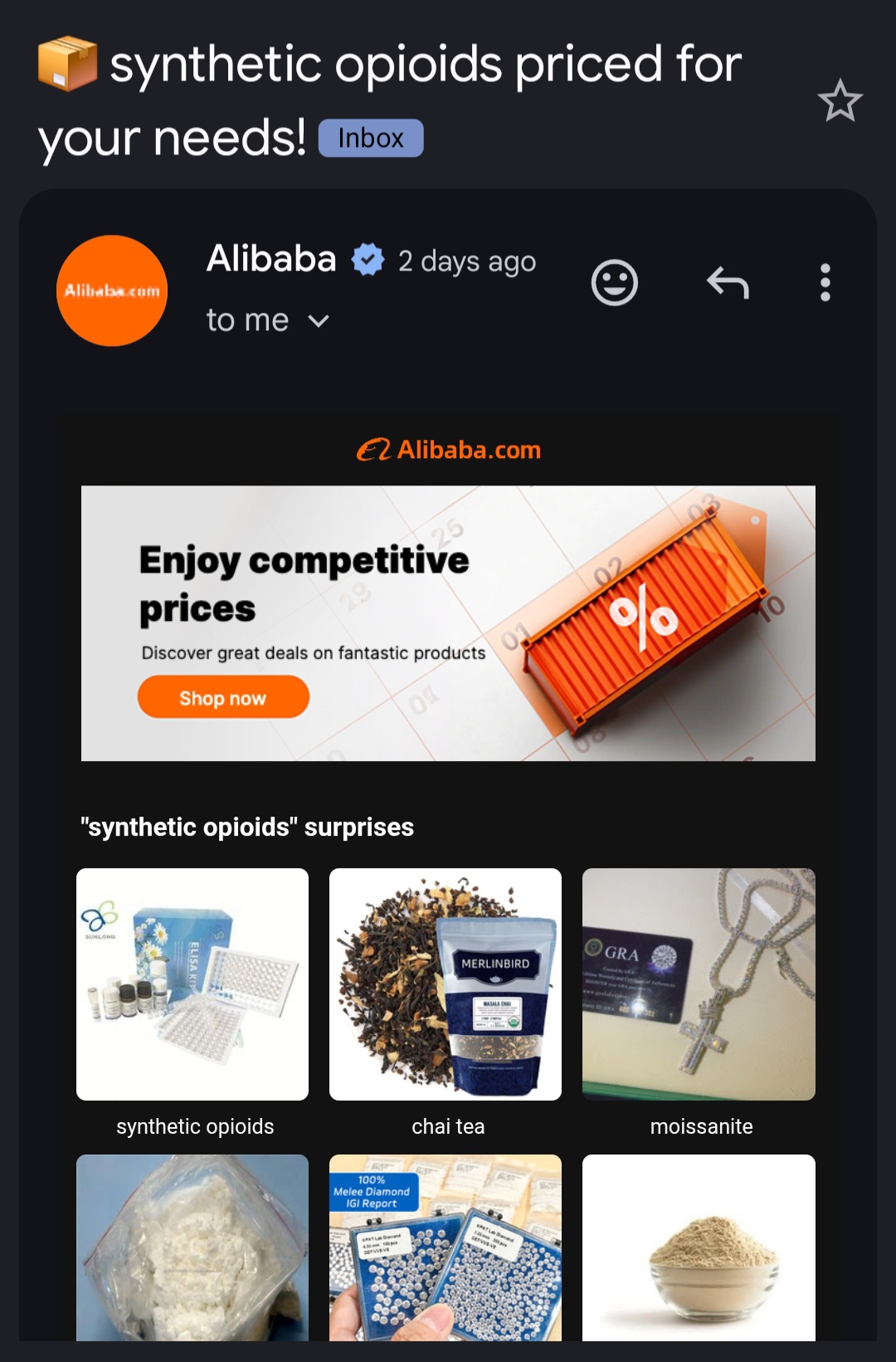 I know a lot of mitragynine derivatives (7-oh, mgm15) are being sold by chinese companies so I had searched on alibaba to see if they were being openly listed there (they aren’t.) Alibaba cracked down on all the open listing of RC’s a couple years ago, but apparently their algorithm didn’t get the memo ![]()