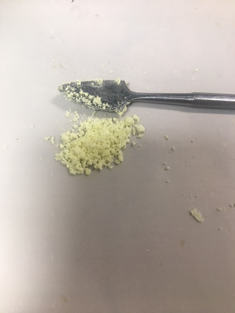 Ok. Final step. I collected the white trippy stuff, pulled away as much of the residual terps that I could on a coffee filter then put it on a hot plate. as it melted I soaked up the clear liquid and isolated the yellow glob. It solidified rapidly after removing it from the heat source. So what we have here is…yellow trippy shit isolate! Looks like sulfur but doesn’t smell like it.